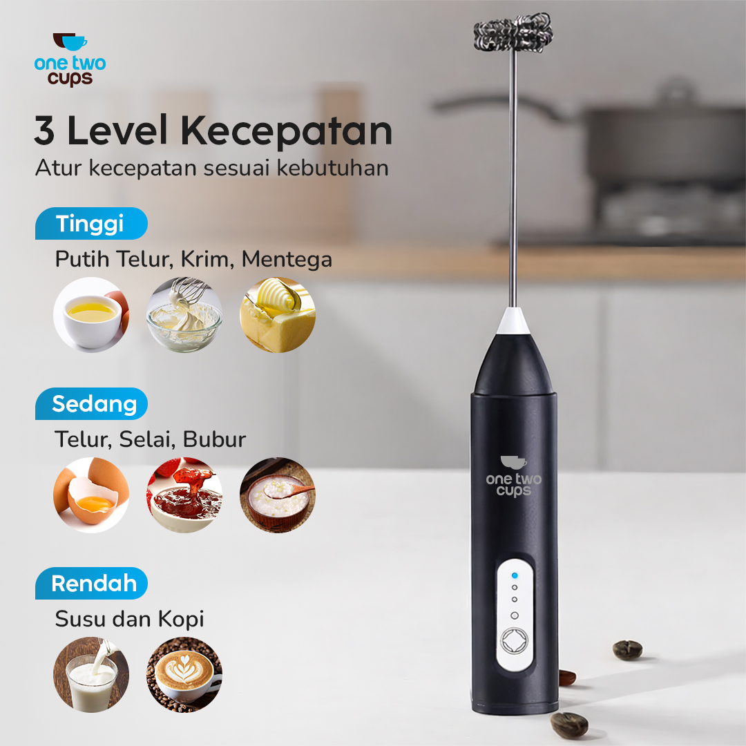Ingin menghasilkan buih susu lembut ala cafe? Hand mixer mini One Two Cups solusinya! Dirancang khusus untuk menciptakan buih susu sempurna, kini Anda dapat menghasilkan buih susu yang lembut dan creamy dalam hitungan detik. Gunakan untuk mengaduk aneka jenis minuman, mulai dari kopi, jus, hingga telur. Semakin praktis dengan baterai rechargeable yang bisa diisi ulang.