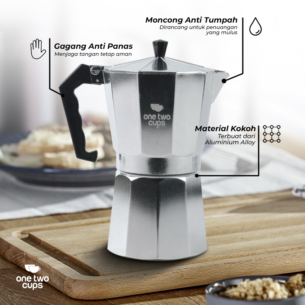 Nikmati sensasi kopi espresso moka pot khas Italia dengan moka pot One Two Cups yang praktis dan mudah digunakan. Alat seduh kopi ini dirancang untuk menghasilkan kopi espresso rumahan dengan cita rasa kuat, aroma kaya, dan karakter autentik layaknya coffee shop. Cocok untuk pemula maupun pecinta kopi, moka pot aluminium alloy ini menjadi solusi ideal bagi Anda yang ingin menyeduh kopi manual brew, kopi hitam pekat, dan espresso tanpa mesin di rumah.