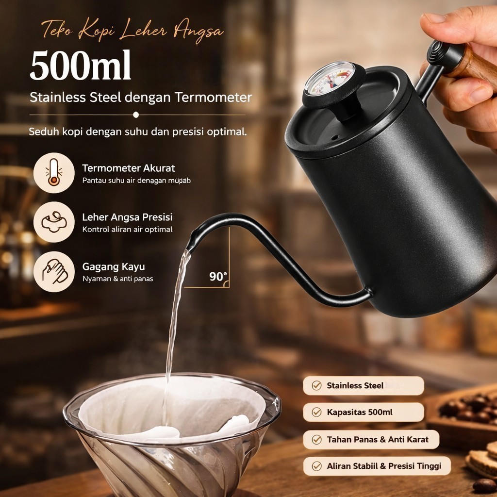 🔹Spout model leher angsa hasilkan aliran air presisi yang cocok untuk mode manual brew seperti pour over.