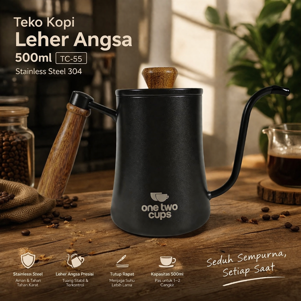 Sajikan setiap minuman dengan teko dari One Two Cups. Kombinasi desain minimalis dan material stainless steel 304 memberikan kesan berbeda sekaligus mampu mempertahankan suhu lebih lama. Teko ini makin lengkap dengan gagang kayu dan corong leher angsa (gooseneck spout) yang memudahkan Anda menuangkan minuman. Dapat digunakan untuk menyeduh kopi, teh, maupun minuman lainnya.
