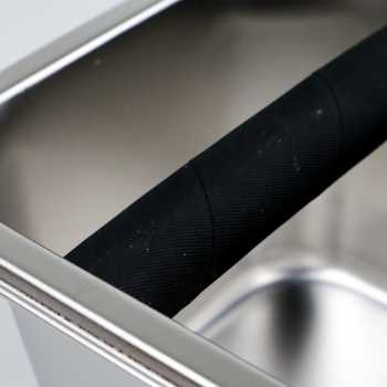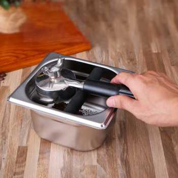 Sisa ampas kopi pada portafilter cukup sulit dikeluarkan. Untuk menghemat waktu, Anda dapat menggunakan wadah yang biasa disebut knock box ini. Wadah dirancang khusus dengan stik untuk mempermudah barista mengeluarkan ampas. Anda hanya perlu mengetuk portafilter pada stik tersebut dan ampas kopi akan jatuh ke dalam wadah. Dengan begitu proses penyajian espresso akan semakin cepat.