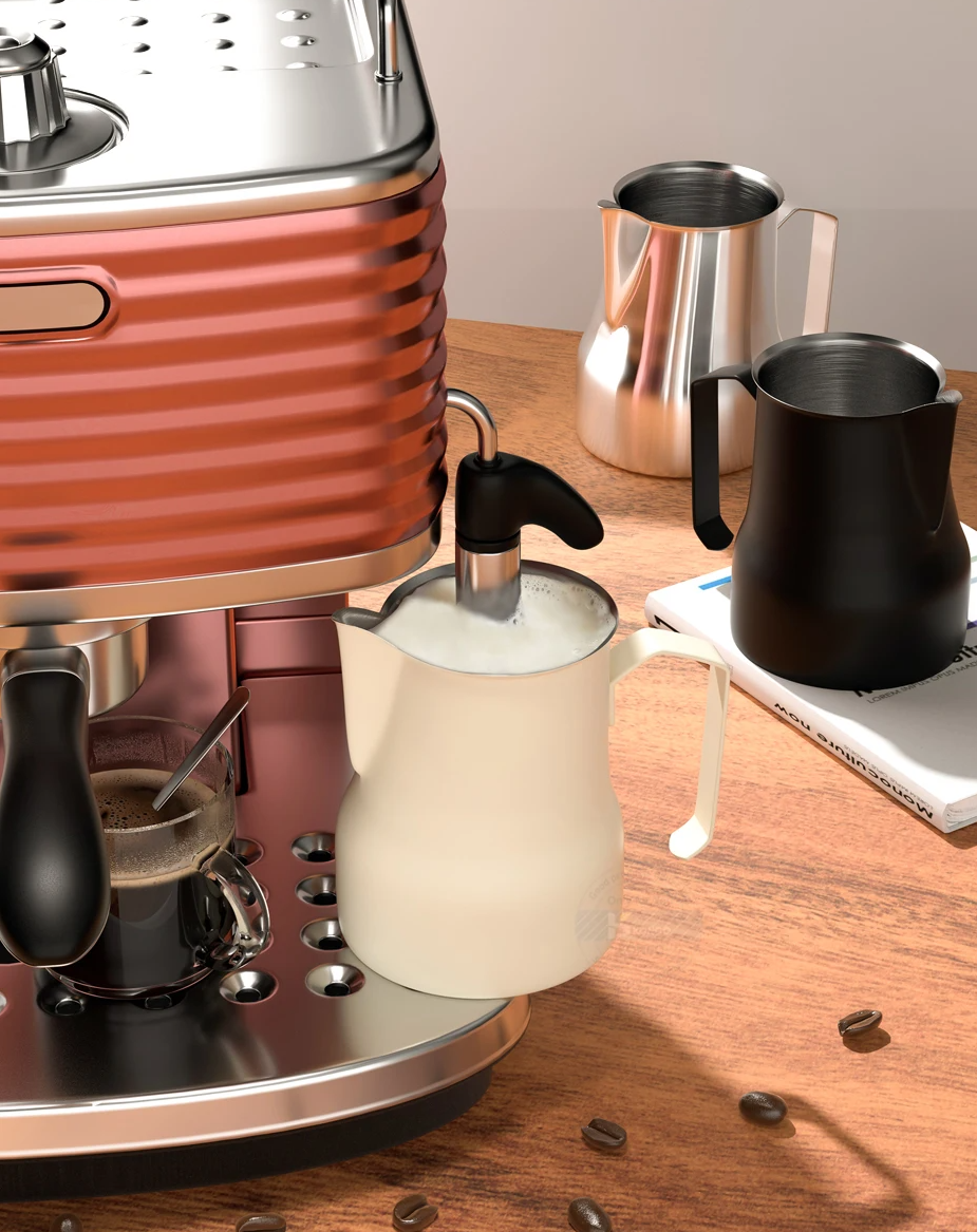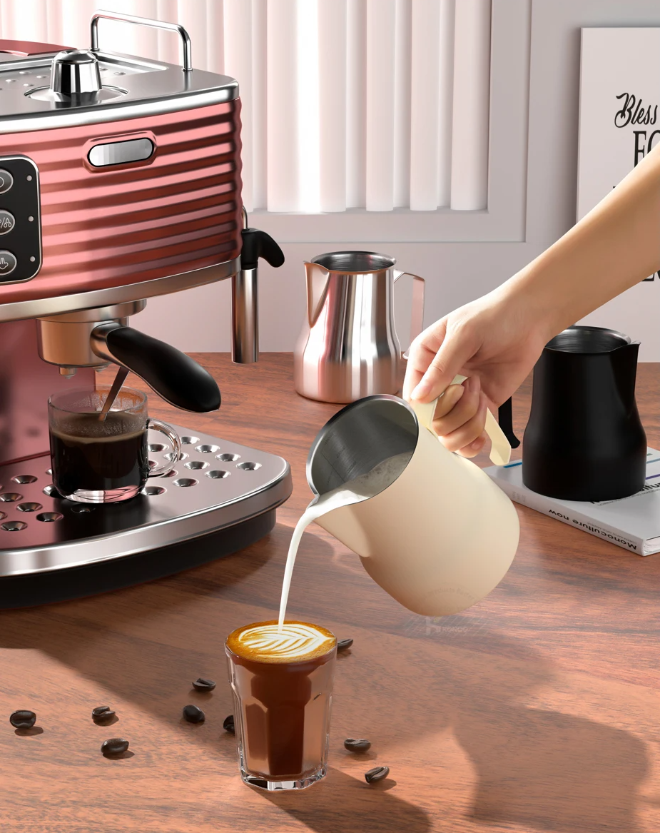 Bentuk corong runcing dengan tekanan ke bawah dirancang khusus untuk menghasilkan aliran susu yang halus dan konsisten. Desain ini sangat membantu dalam membuat latte art seperti heart, rosetta, hingga tulip dengan kontrol maksimal.