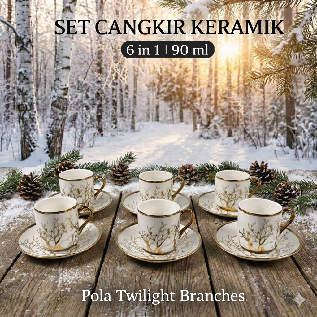ONLYJIA Set Cangkir Kopi Keramik 6in1 Plated Pattern Coffee Cup 90ml Twilight Branches - DW3355 - White/Gold