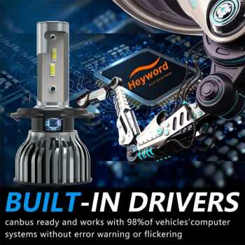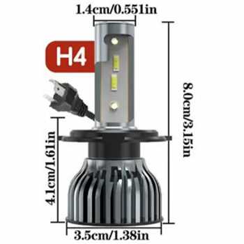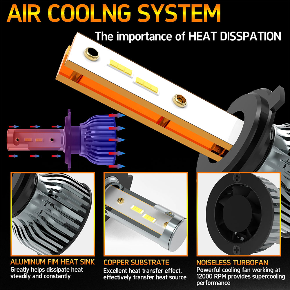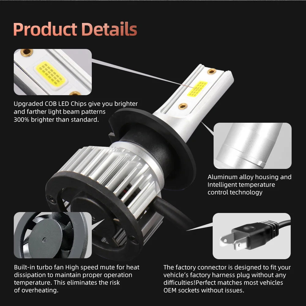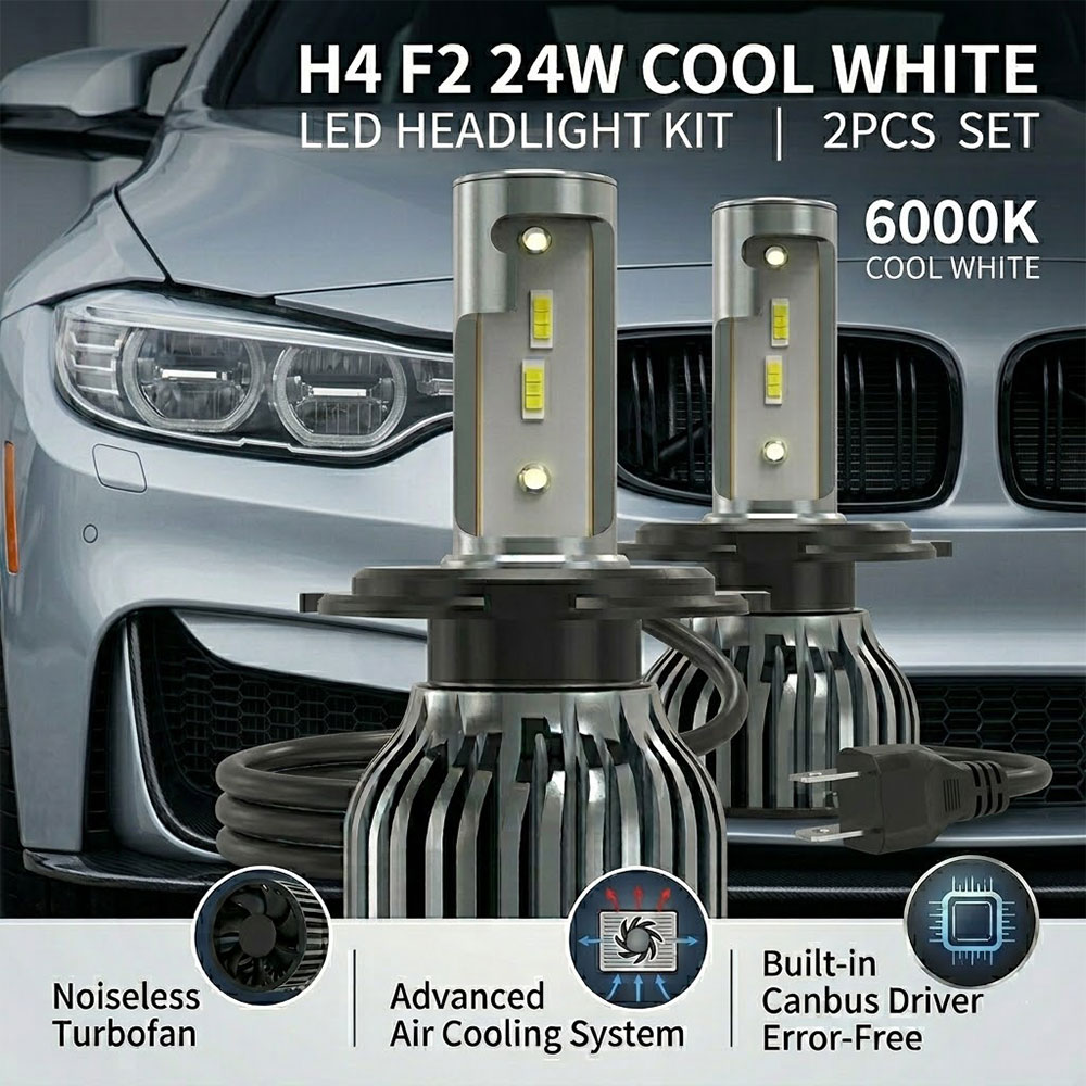 Lampu depan mobil LED mobil H4 F2 1860 LED 6000 K dengan cahaya putih terang hingga 2700 lumens, setiap lampu memiliki konsumsi daya 24 W dan dalam satu paket terdiri dari 2 lampu sehingga total daya menjadi 48 W,12 V, dilengkapi turbo fan dan heatsink aluminium untuk pendinginan optimal, fitur Canbus anti error tanpa flicker, serta desain plug & play yang mudah dipasang tanpa modifikasi, tahan air IP68 sehingga aman digunakan di segala kondisi.