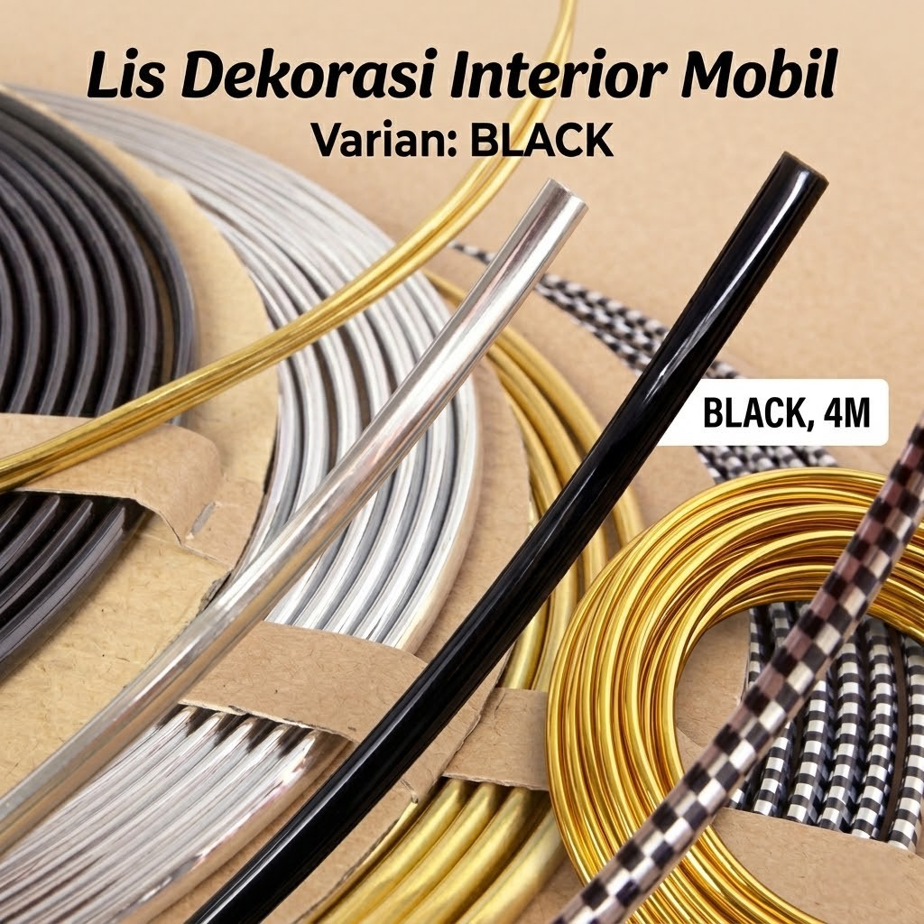 Lis bodi PVC glossy 4 M, pilihan warna emas, dark gray, silver, dan hitam. Tahan benturan ringan, lentur, dan mudah dipasang. Estetik dan protektif, cocok untuk interior dan eksterior mobil. Tampilan mewah tanpa modifikasi besar.