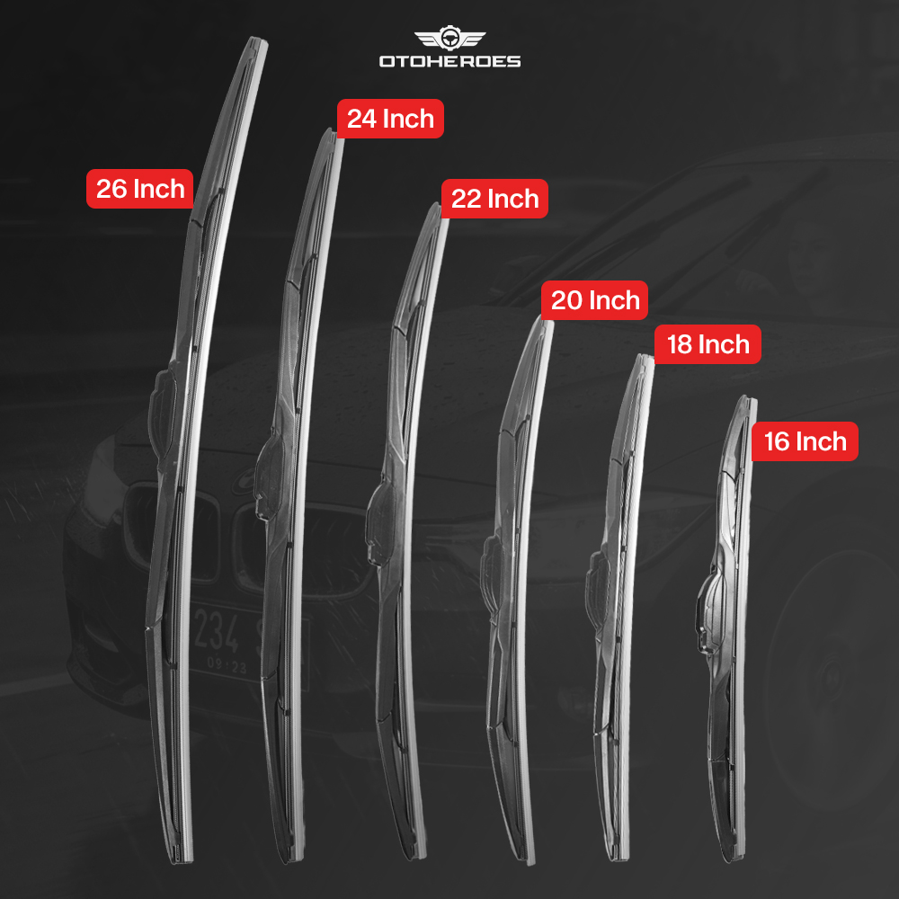 | Aneka Pilihan Ukuran Menawarkan 6 varian ukuran, mulai dari 16, 18, 20, 22, 24, hingga 26 Inch, wiper kompatibel dengan berbagai model dan seri mobil. Pilih ukuran yang sesuai dengan kaca mobil untuk hasil terbaik. |