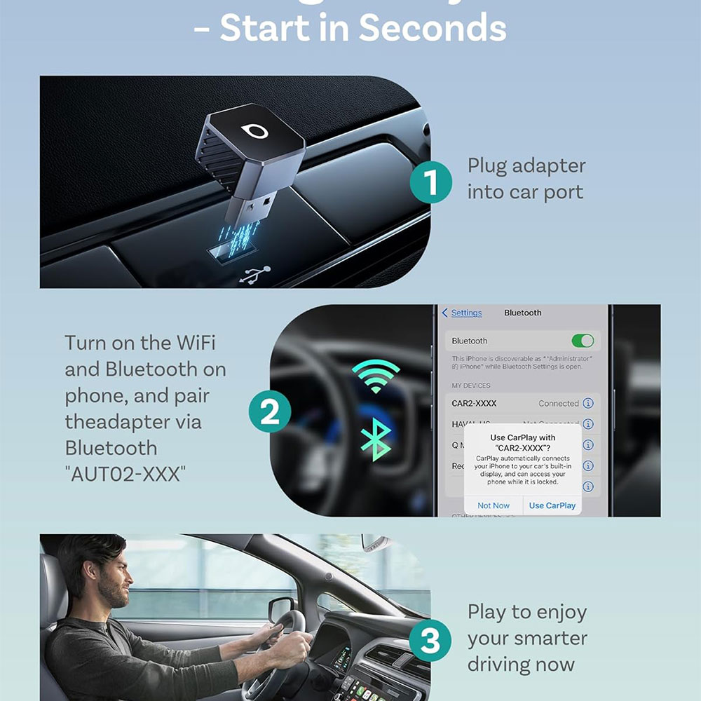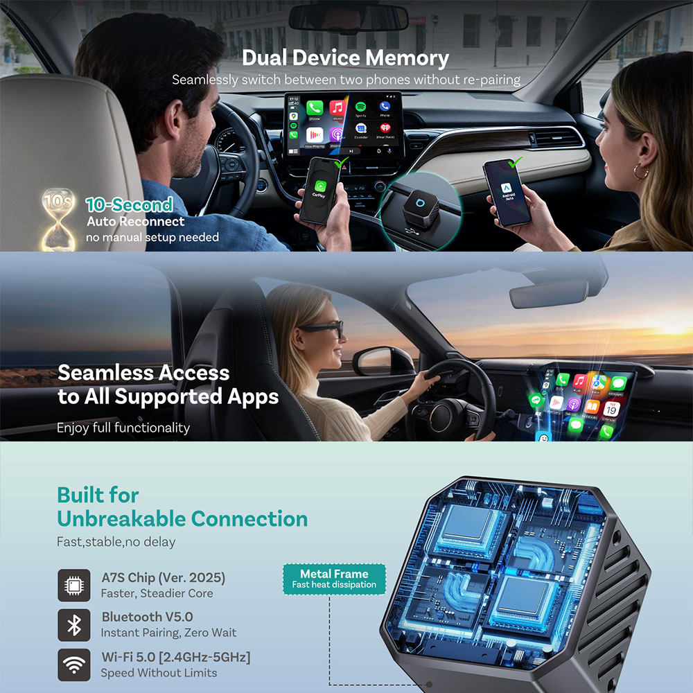| Koneksi Wireless Super Cepat Mengubah sistem CarPlay dan Android Auto kabel menjadi wireless hanya dengan sekali setup. Setelah pairing pertama, perangkat akan otomatis terhubung saat mobil dinyalakan. Tidak perlu lagi repot dengan kabel yang berantakan. |