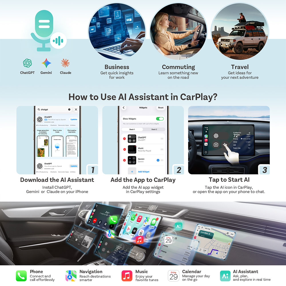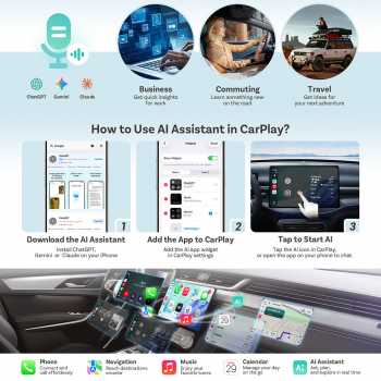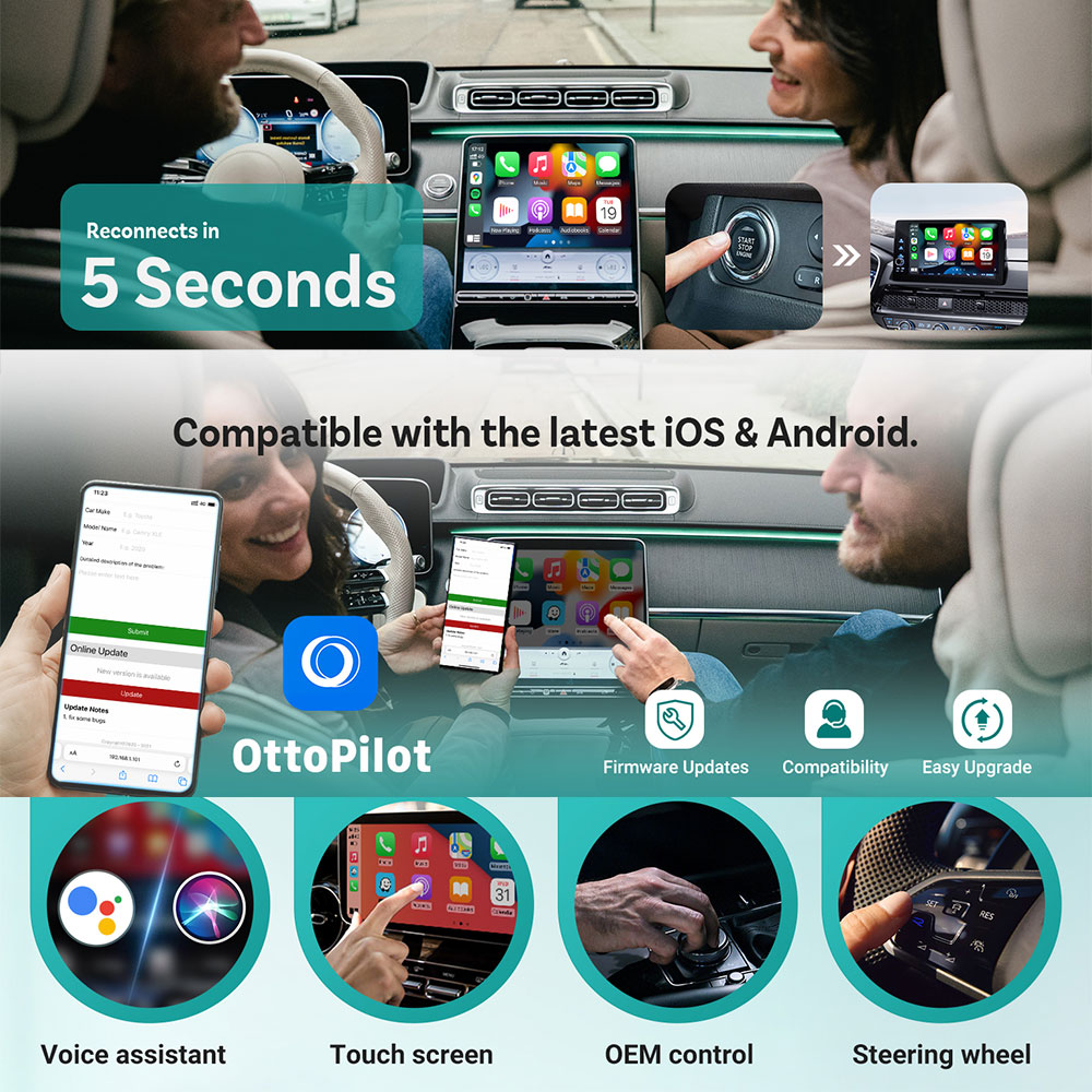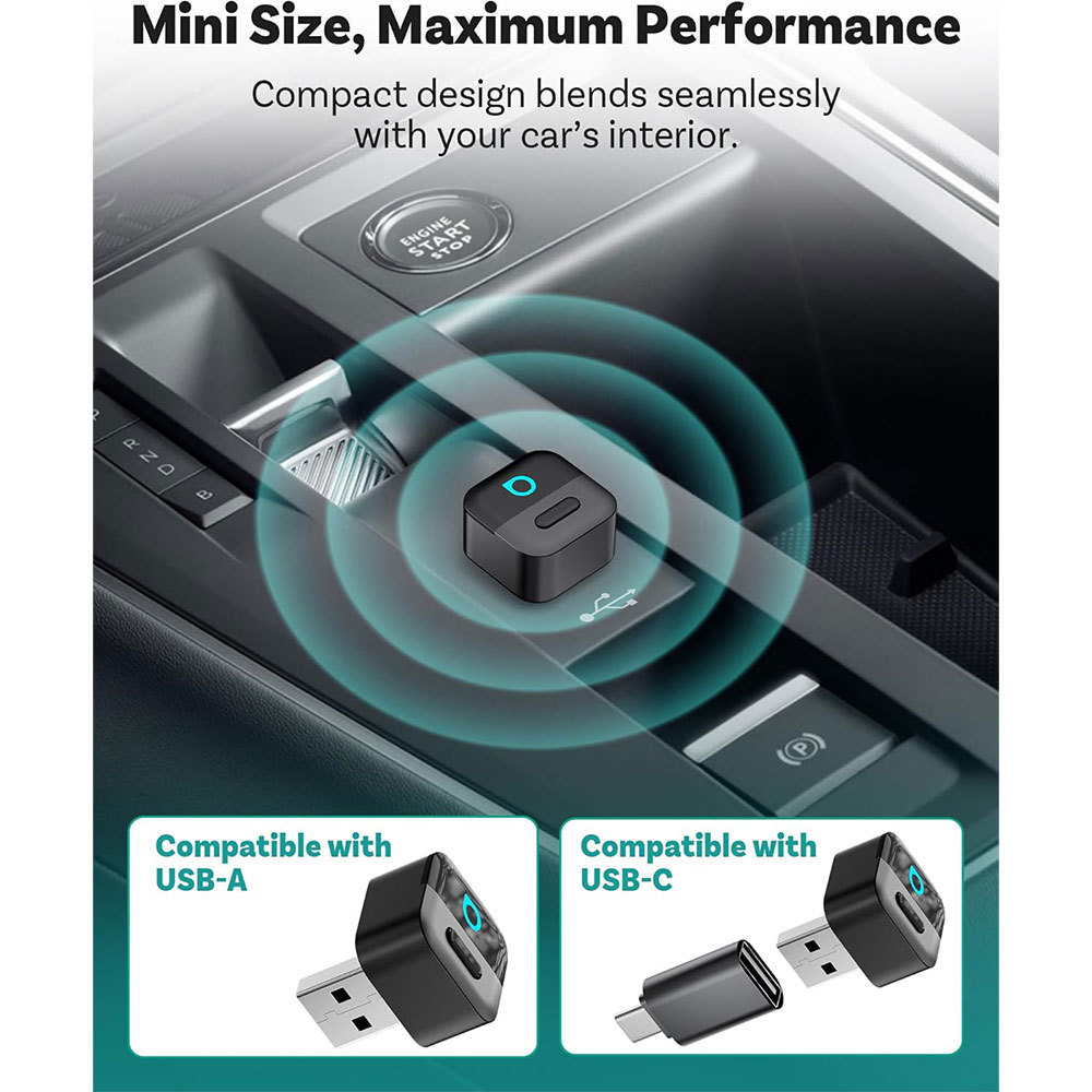 | Desain Kompak dan Portabel Tetap mendukung semua kontrol bawaan mobil seperti touchscreen, tombol setir, knob, hingga voice assistant (Siri / Google Assistant). Ukuran mini membuatnya tidak mengganggu interior dan tetap terlihat rapi. Penggunaan terasa natural seperti fitur bawaan mobil tanpa tambahan device. |