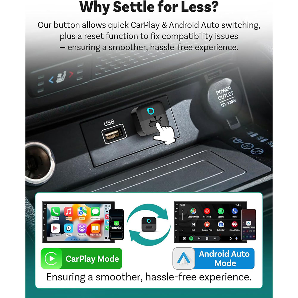 | Tanpa Kabel Lebih Ringkas Adapter ini mengubah CarPlay dan Android Auto dari kabel menjadi wireless secara otomatis. Kamu tetap bisa menggunakan semua fitur seperti Google Maps, Spotify, dan telepon tanpa perlu colok kabel setiap kali. Pengalaman berkendara jadi lebih praktis, aman, dan terlihat lebih modern dengan wireless CarPlay mini slim dari Ottocast. |