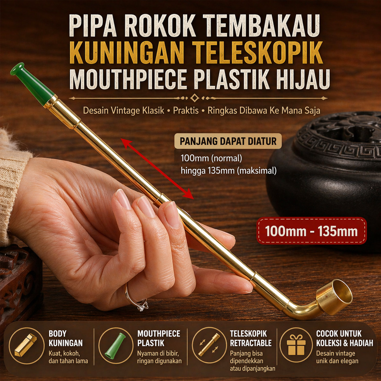 | Desain Teleskopik Fleksibel Panjang pipa dapat diatur dari 100 mm hingga 135 mm sesuai kebutuhan. Saat digunakan bisa dipanjangkan agar lebih nyaman, dan saat disimpan dapat dipendekkan agar hemat tempat. Fitur ini membuat pipa rokok lebih praktis dibawa bepergian. |
