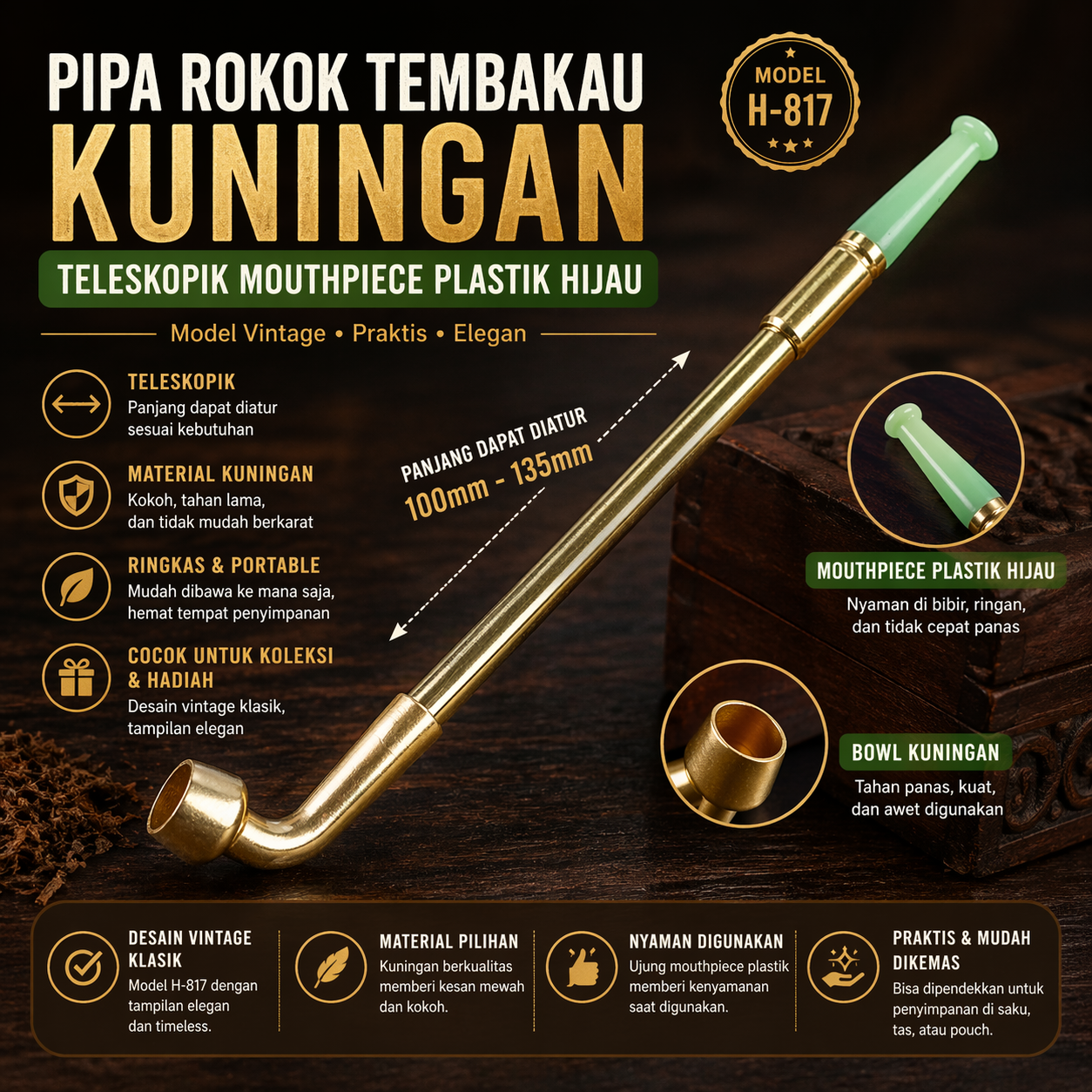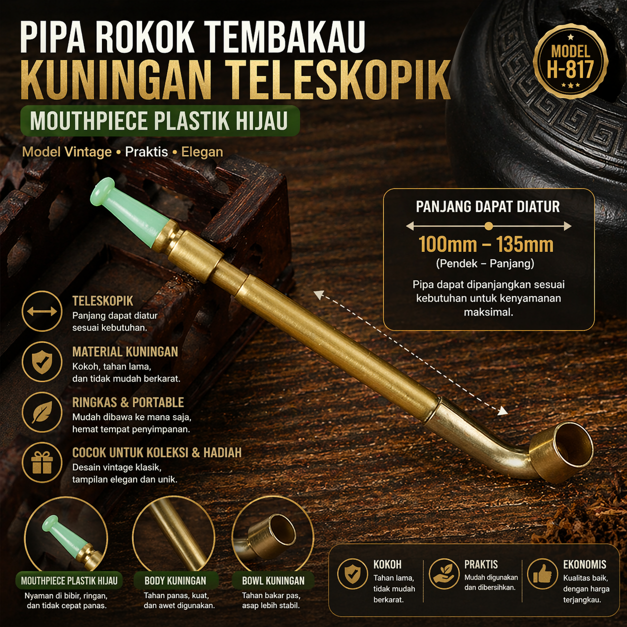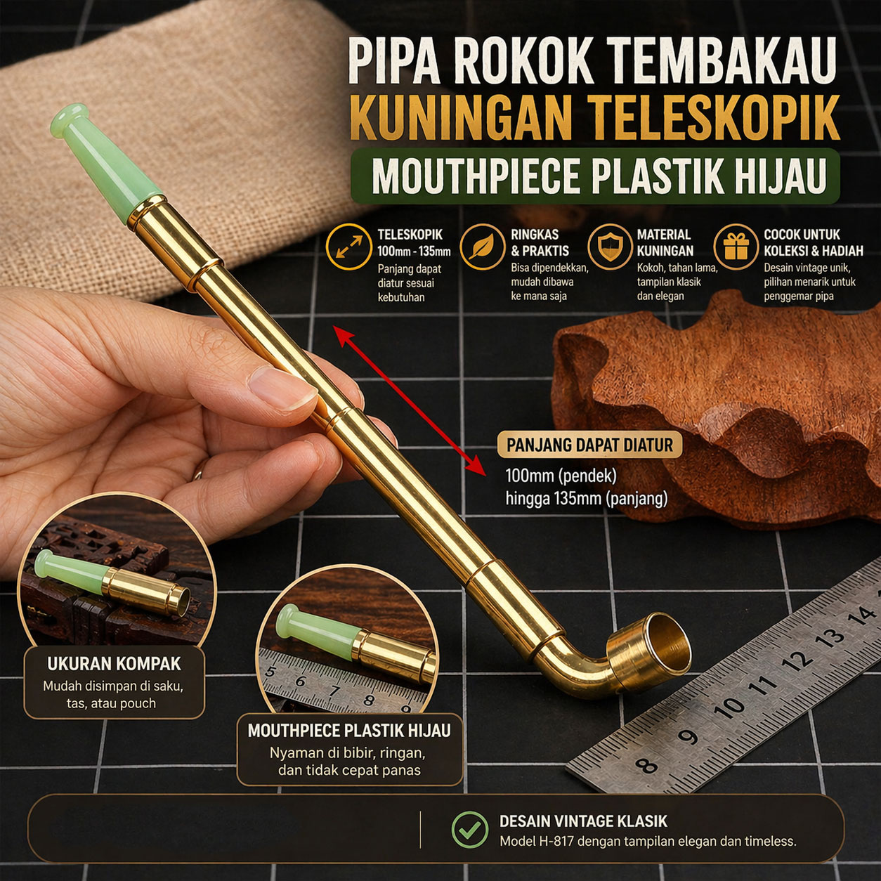| Model Vintage Klasik Desain H-817 terinspirasi pipa klasik tempo dulu yang unik dan menarik perhatian. Cocok digunakan sebagai pelengkap gaya personal, pajangan meja, maupun koleksi. Model timeless seperti ini tetap menarik sepanjang waktu. |