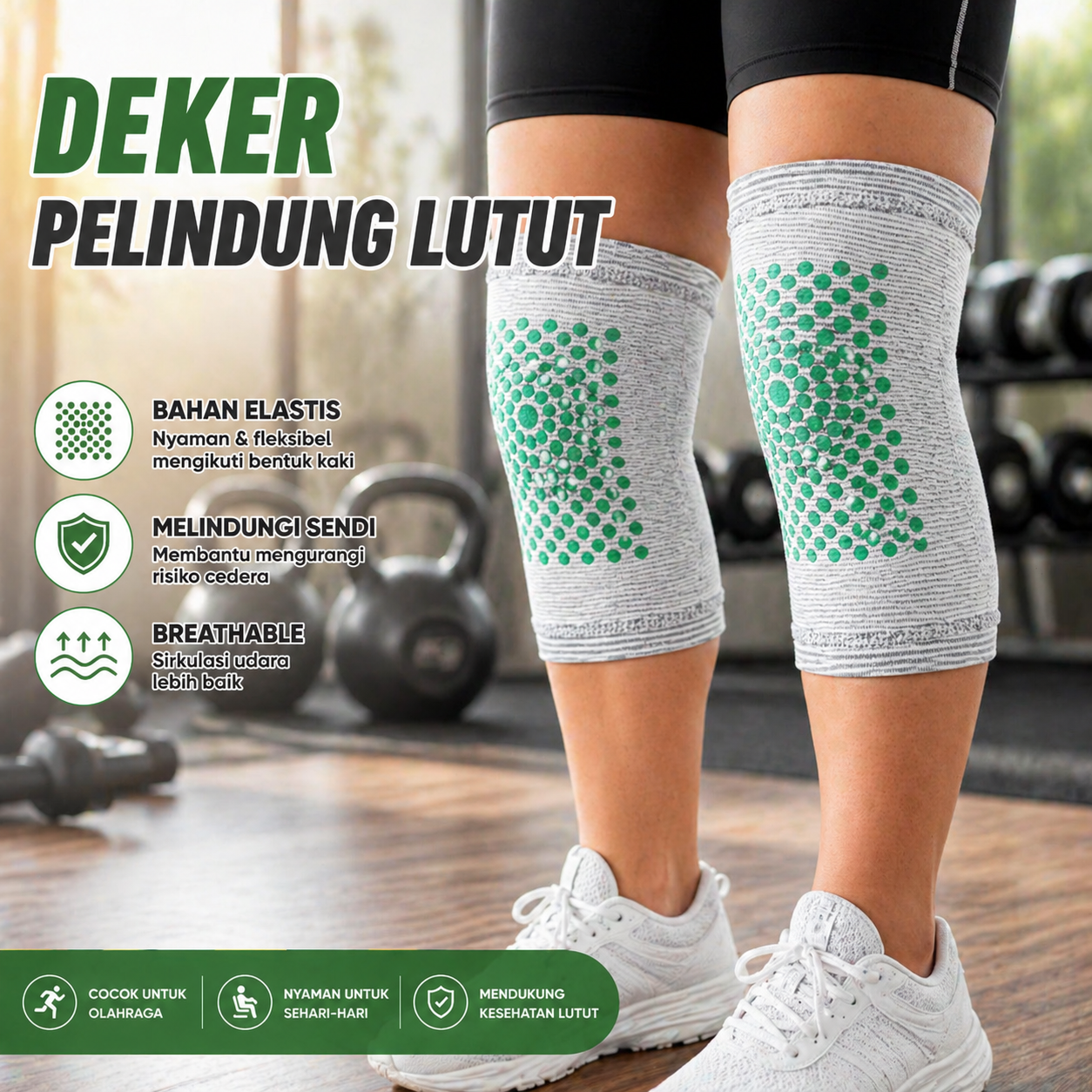 Dapat digunakan untuk gym, fitnes, jogging, badminton, basket, futsal, hiking ringan, hingga aktivitas rumah tangga. Solusi praktis untuk melindungi lutut kapan saja.