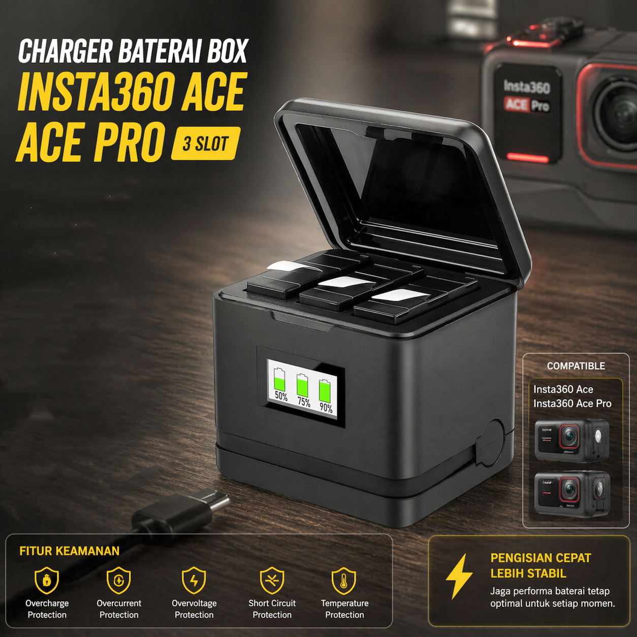 Jika Anda ingin mengisi daya baterai Insta360 sekaligus menyimpannya, Anda bisa menggunakan charger baterai box dari Probty. Charger baterai box memiliki 3 slot sehingga Anda bisa mengisi daya 3 baterai sekaligus secara bersamaan. Berkat fitur fast charging, charger baterai box mampu mengisi daya baterai kamera aksi dengan cepat. Dilengkapi dengan layar OLED untuk memberi informasi tentang kapasitas baterai. Selain untuk mengisi daya, charger box juga bisa Anda gunakan untuk menyimpan baterai.