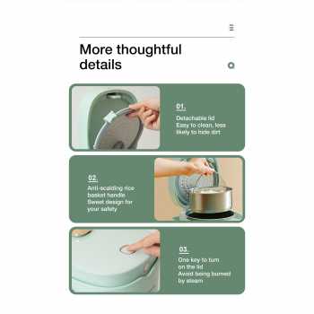 | Matang Merata dan Pulen Pemanasan yang merata akan memastikan cita rasa yang konsisten di setiap butir beras. Hal ini meminimalkan risiko adanya bagian beras yang kurang matang atau terlalu matang. Fungsi ini makin disempurnakan dengan lubang-lubang uap untuk hasilkan nasi pulen dan elastis dengan nutrisi yang terjaga.