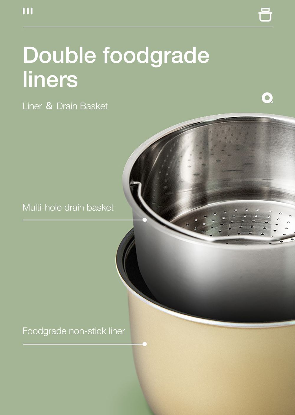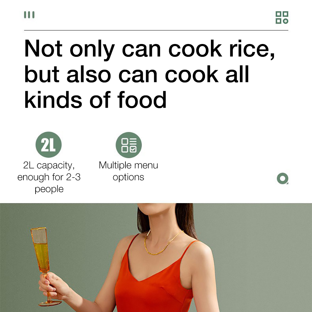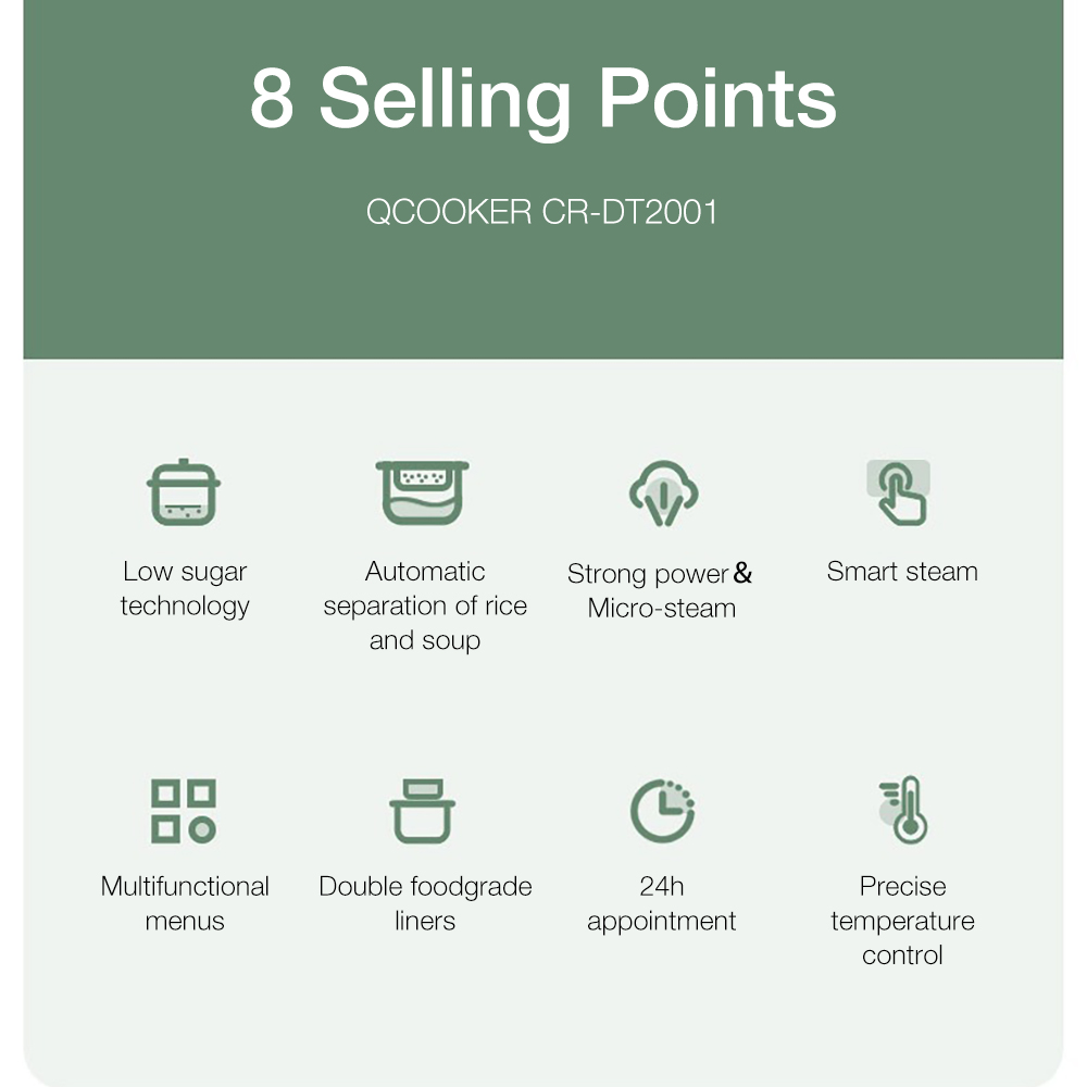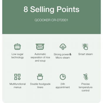 Ingin menikmati nasi pulen yang rendah gula? Inilah saatnya untuk menggunakan rice cooker pintar dari QCOOKER. Dibekali teknologi khusus yang mampu memisahkan unsur gula di dalam nasi tanpa membuang nutrisinya. Nasi yang dihasilkan juga elastis dan pulen sehingga lebih nikmat. Canggihnya lagi, rice cooker ini dibekali layar holograpic yang akan menampilkan mode dan level masak yang digunakan.