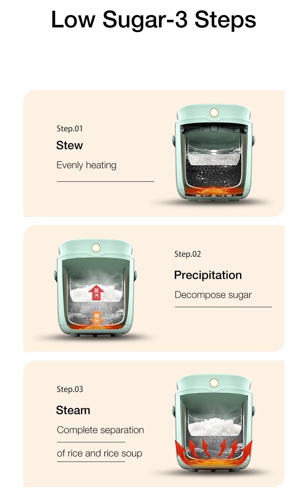 | 3 Langkah Rendah Gula Untuk membuat nasi yang rendah gula, rice cooker ini mengadopsi 3 langkah inovatif. Langkah pertama adalah pemanasan merata yang dilanjutkan dengan pengendapan unsur gula di dalam beras. Endapan air dan nasi rendah gula pun akan terpisah sempurna dan siap dinikmati.