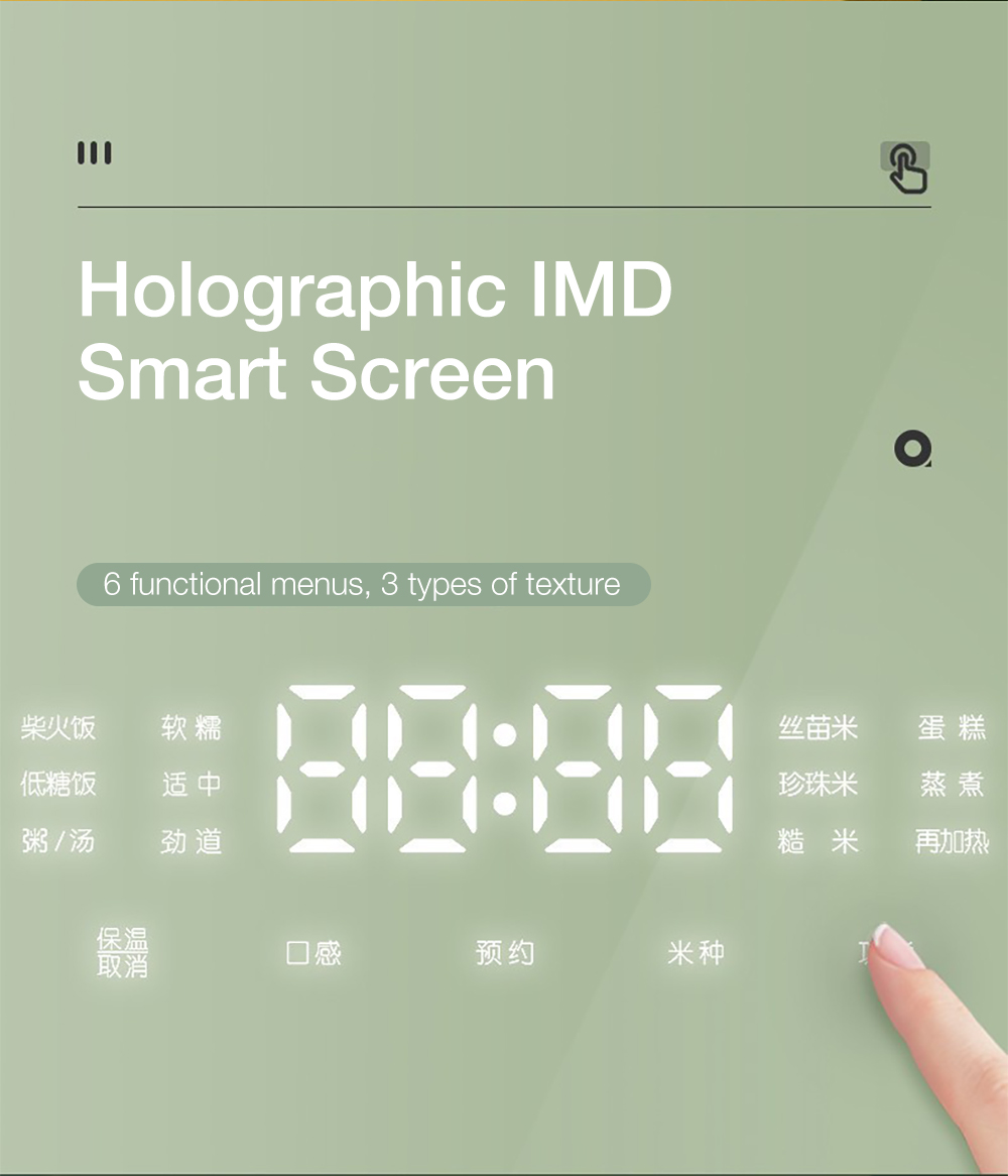| Canggih dengan Holograpic Untuk menghasilkan masakan terbaik, rice cooker ini dibekali 6 menu dan 3 tipe tekstur. Seluruh mode dan level bisa Anda akses pada tombol yang tersedia. Pengaturan yang Anda lakukan akan tampak jelas melalui layar holograpic.