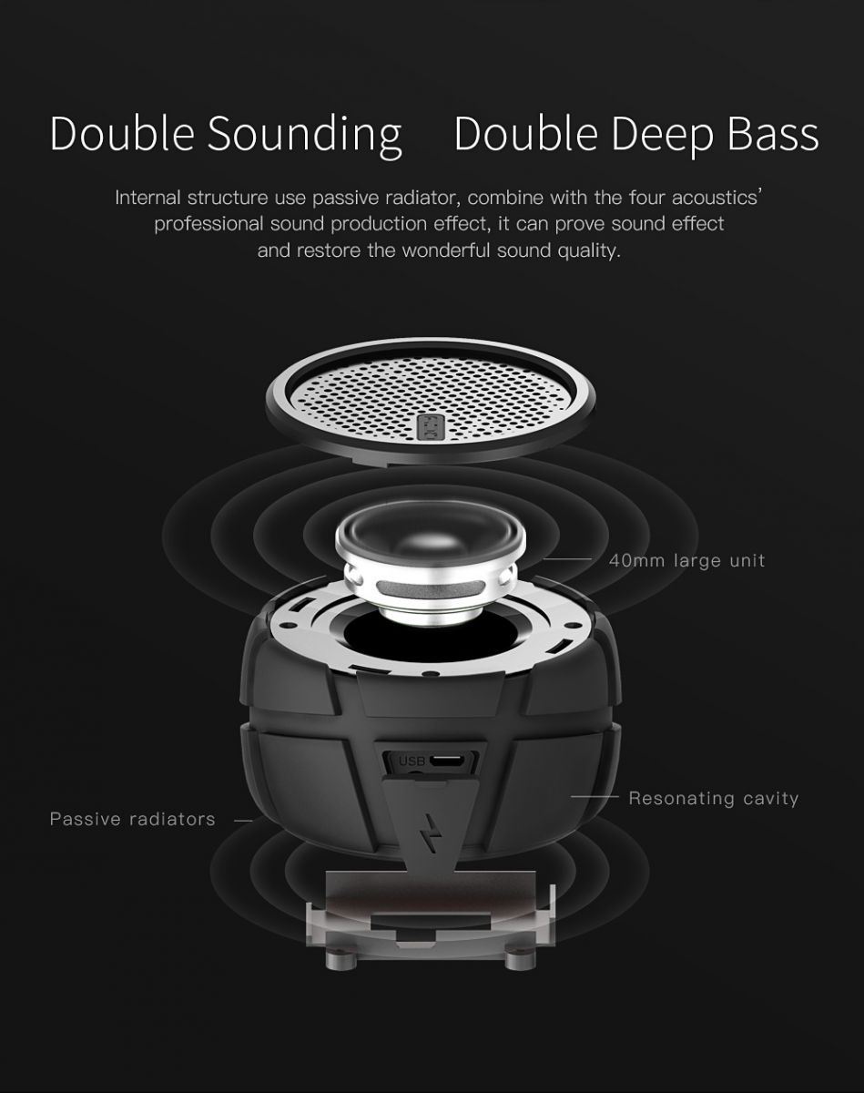 Speaker ini menggunakan sebuah driver berukuran 40mm yang mampu menghasilkan kuantitas suara yang sangat besar dan jernih, cocok digunakan diluar ruangan karena suara yang besar dan tetap terdengar meskipun diluar ruangan.