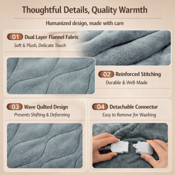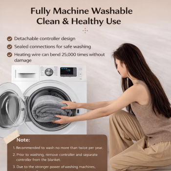 | Rasakan Hangat yang Sempurna Suhu selimut bisa disesuaikan dengan menekan tombol remot. Memiliki rentang suhu 20-45 °C dengan 4 tingkat sehingga Anda bisa memilih tingkat kehangatan yang paling pas dengan kebutuhan tubuh. Teknologi pemanas yang digunakan menjamin distribusi panas merata, tanpa ada titik panas berlebih yang bisa mengganggu kenyamanan. |