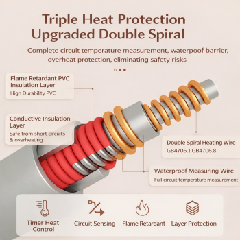 | Fleksibel Tidak Mudah Rusak Kabel pemanas fleksibel dirancang tahan lipatan dan tidak mudah rusak. Struktur spiral ganda membuat daya tahan lebih lama dibanding selimut elektrik biasa. Cocok untuk penggunaan harian. |