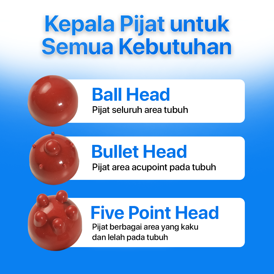 | Kepala Pijat untuk Semua Kebutuhan Hilangkan rasa lelah dan kaku lebih efektif dengan 3 pilihan kepala pijat yang bisa dipilih sesuai kebutuhan. Mulai dari ball head hingga five point head, semua efektif untuk rilekskan otot. |
