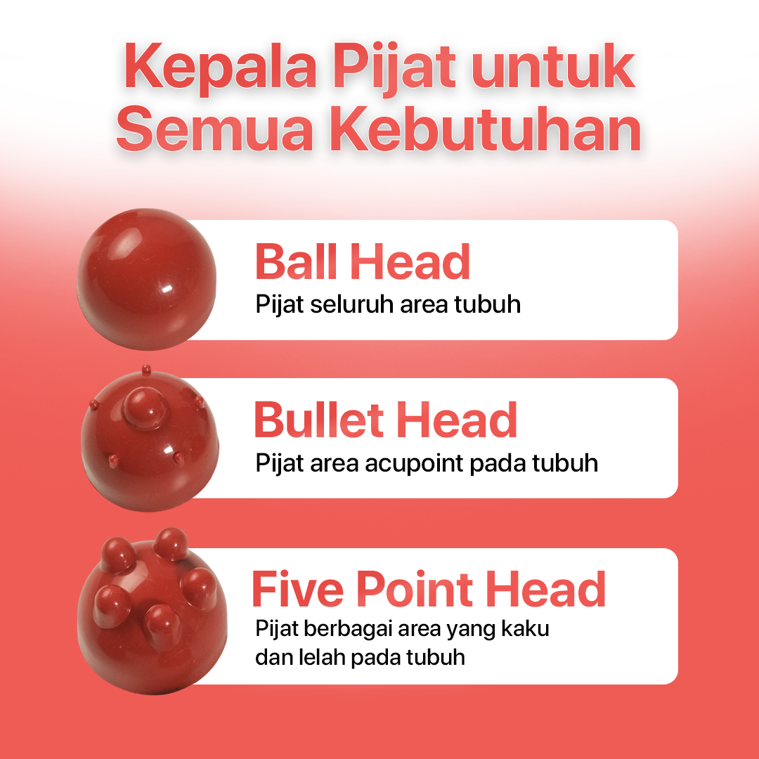 | Kepala Pijat untuk Semua Kebutuhan Hilangkan rasa lelah dan kaku lebih efektif dengan 3 pilihan kepala pijat yang bisa dipilih sesuai kebutuhan. Mulai dari ball head hingga five point head, semua efektif untuk rilekskan otot. |