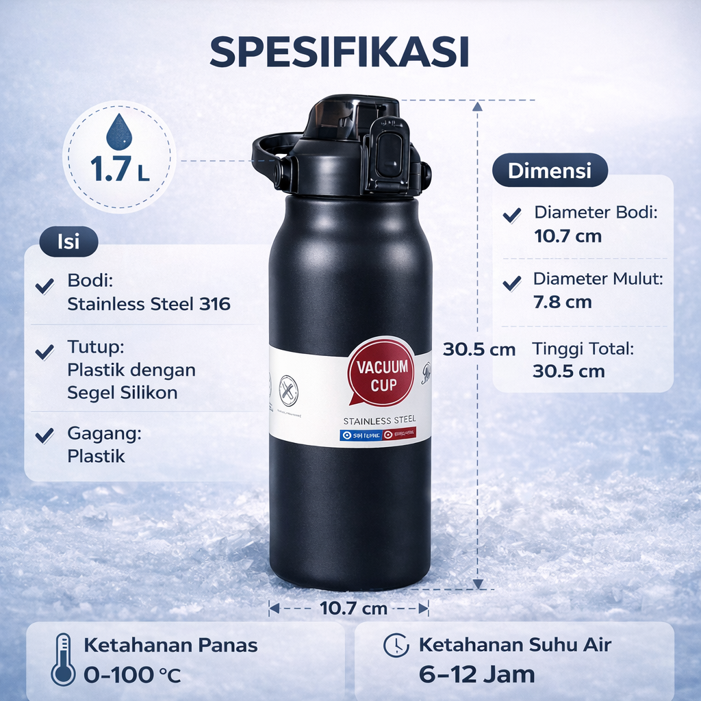 | Kapasitas Besar 1.7 L Dengan kapasitas 1.7 L, botol ini ideal untuk memenuhi kebutuhan cairan harian tanpa perlu mengisi ulang. Cocok digunakan saat olahraga, kerja, camping, atau perjalanan jauh. Kapasitas besar membantu menjaga hidrasi lebih praktis dan efisien. |