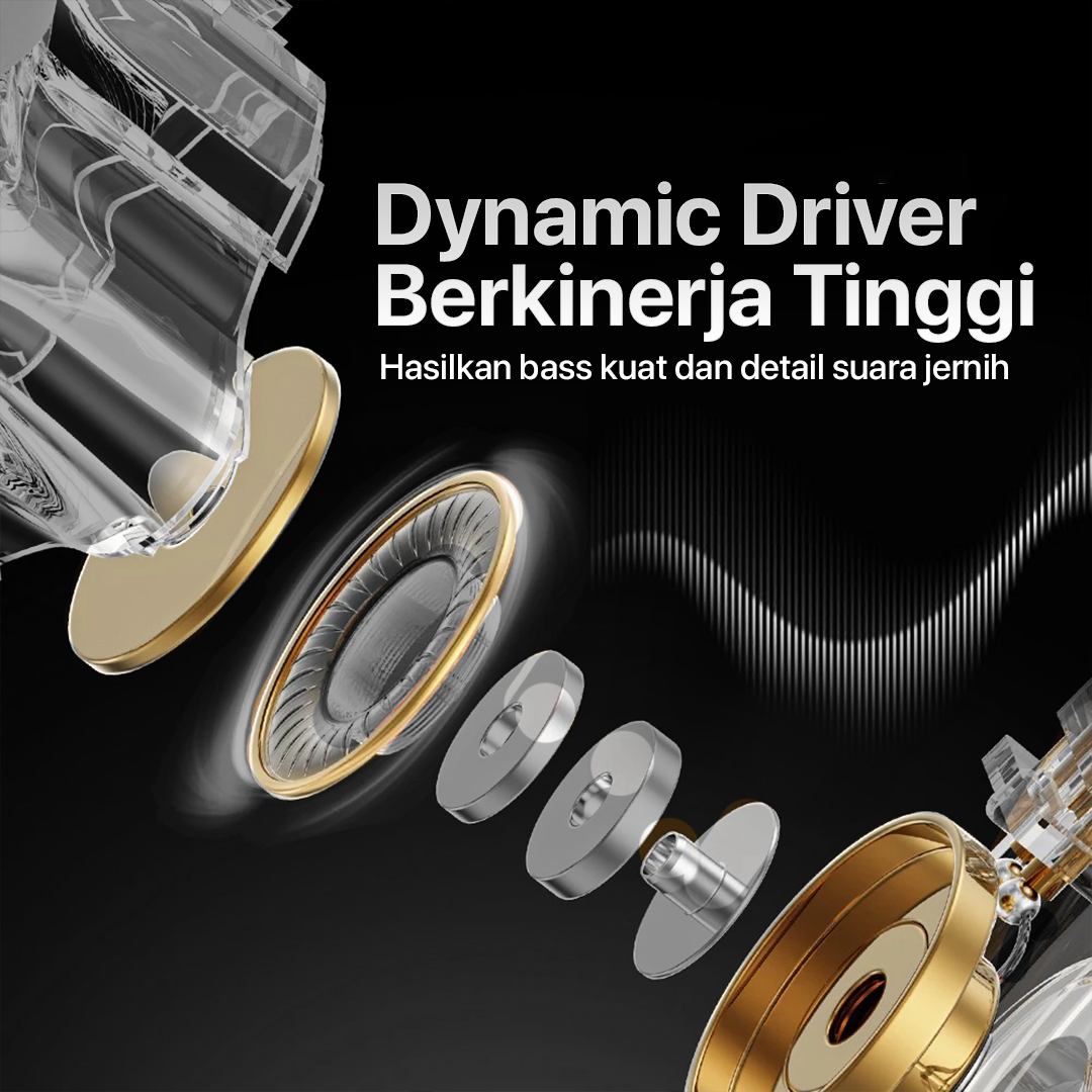 | Suara Lebih Hidup Teknologi dynamic driver menghasilkan kualitas suara yang lebih detail dan seimbang antara treble, mid, dan bass sehingga setiap nada terdengar lebih jelas. |