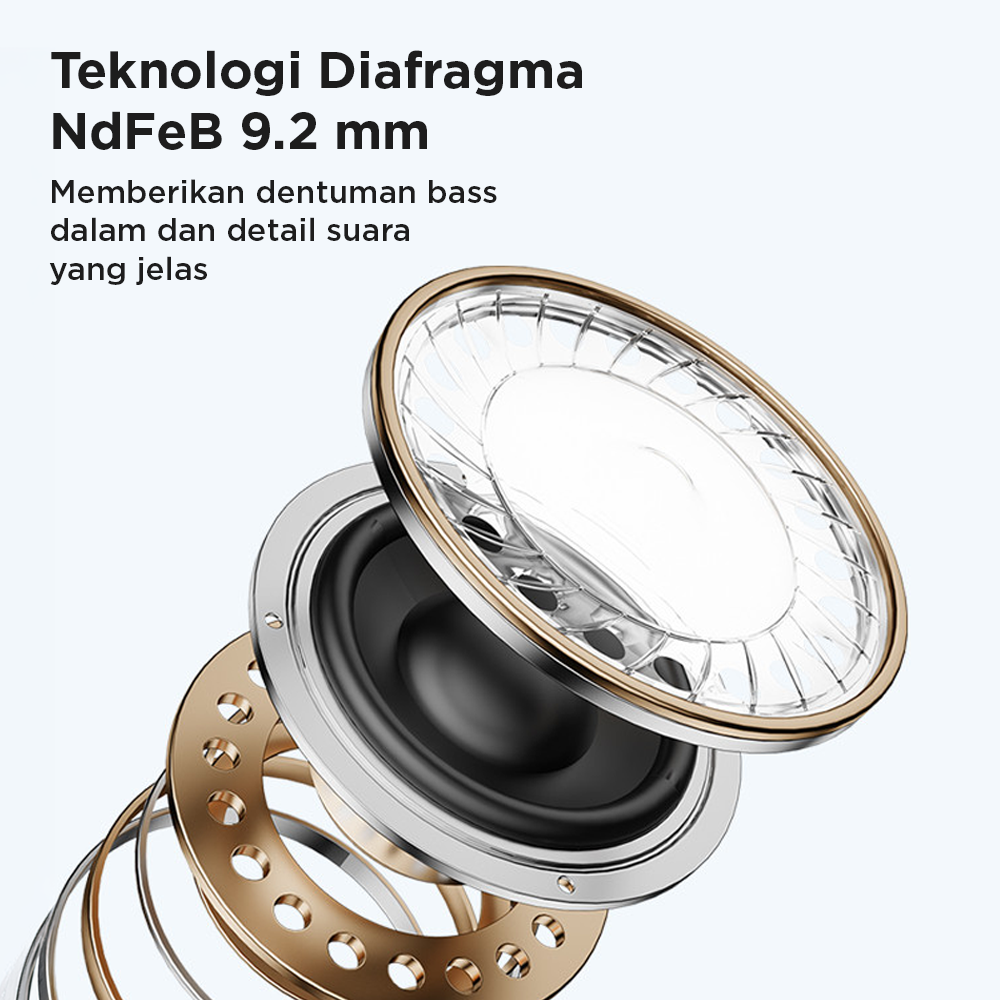 | Diafragma NdFeB 9.2 mm Mengusung penggunaan driver NdFeB yang menghasilkan suara dengan bass yang kencang cocok digunakan untuk mendengar lagu EDM dan pop. |