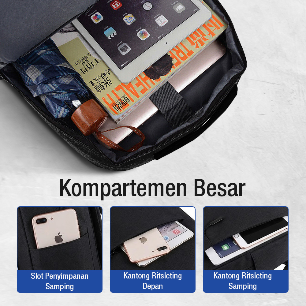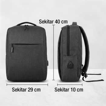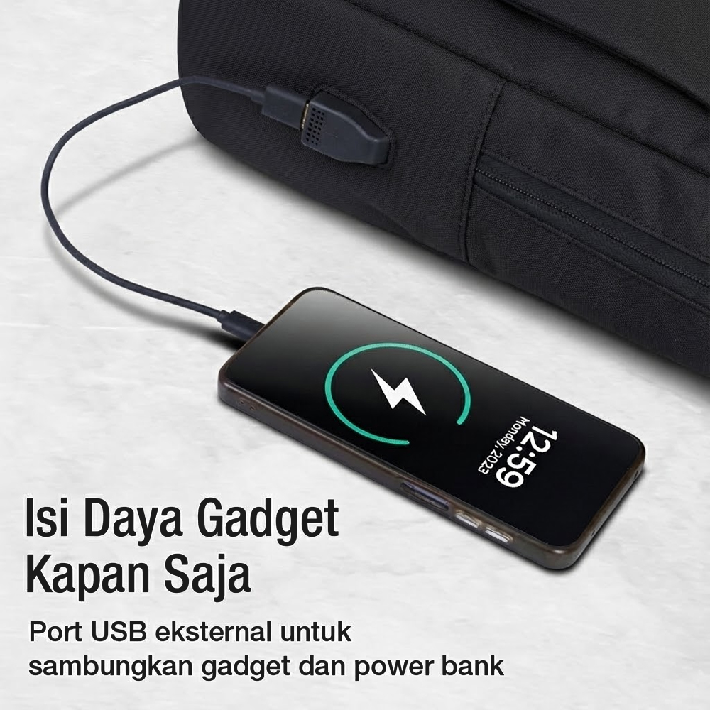 | Isi Daya Gadget Kapan Saja Tak perlu repot mencari charger atau power bank. Tas ransel laptop ini sudah dilengkapi port USB eksternal yang bisa langsung dipakai untuk menghubungkan gadget dan power bank. |
