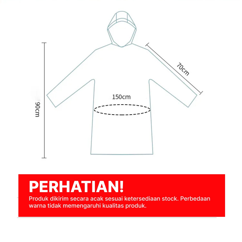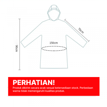 Panjang Jas Hujan: 90 cm Lebar Bahu: 60 cm Lingkar Dada: 150 cm Panjang Lengan: 70 cm
