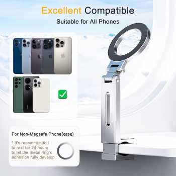 | Kompatibel dengan Semua Jenis Smartphone Holder ini dapat digunakan untuk hampir semua smartphone, baik iPhone maupun Android. Untuk perangkat yang sudah mendukung MagSafe, Anda bisa langsung menggunakannya. Sementara untuk smartphone non-MagSafe, tersedia opsi penggunaan ring metal tambahan yang cukup ditempelkan dan didiamkan sekitar 24 jam agar daya rekat maksimal. |