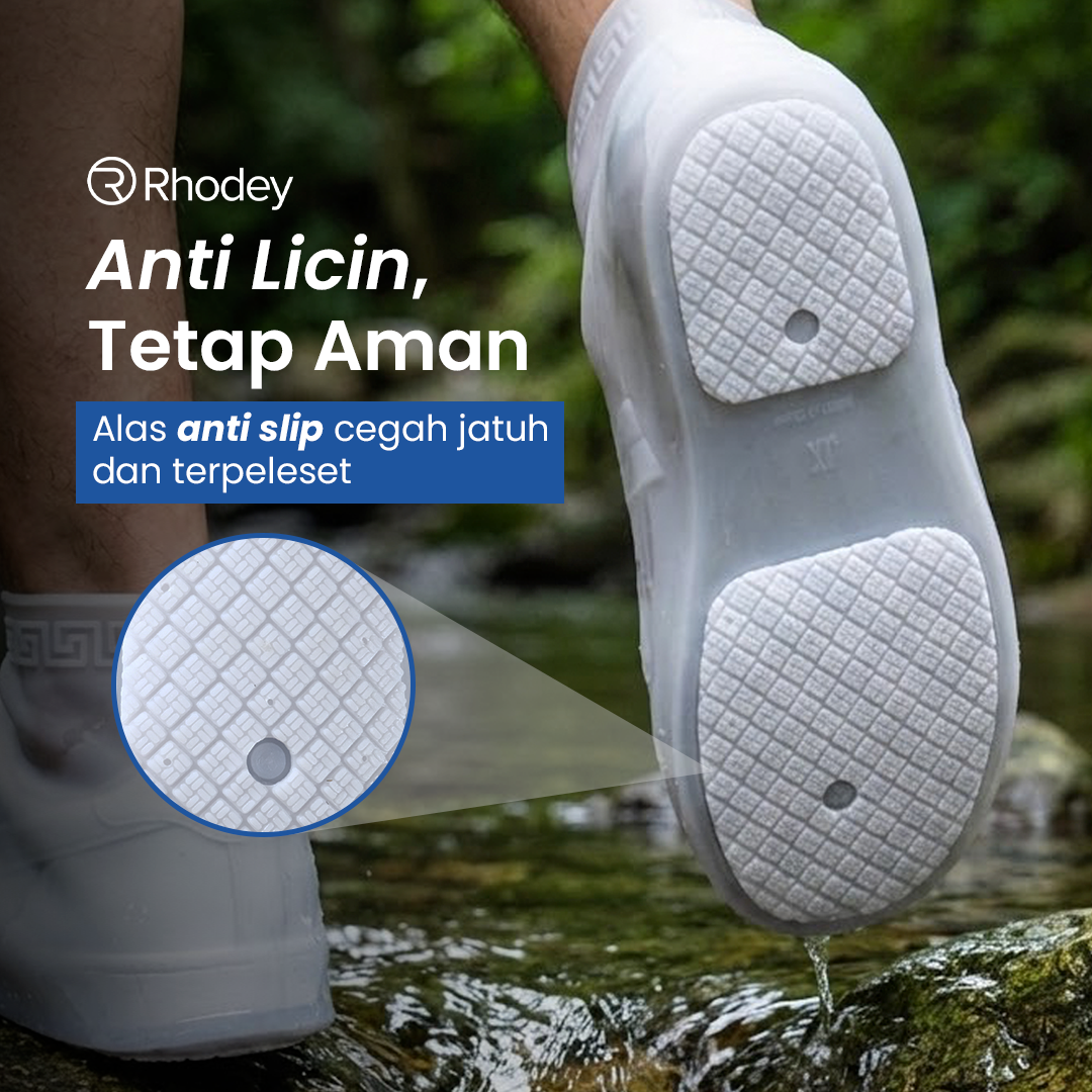 Berjalan saat hujan tetap aman berkat pola anti slip pada alas jas hujan sepatu. Pola ini mencegah Anda terpeleset atau jatuh saat berjalan di permukaan yang licin.
