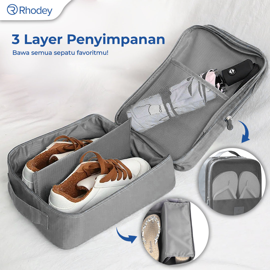 Tak perlu repot membawa banyak tas untuk menyimpan sepatu selama bepergian. Tas sepatu Rhodey hadir dengan 3 layer yang bisa Anda gunakan untuk menyimpan sepasang sepatu dan 2 pasang sandal jepit. Bentuk yang compact lengkap dengan ritsleting memastikan sepatu dan alas kaki lainnya dapat tersimpan dengan aman.