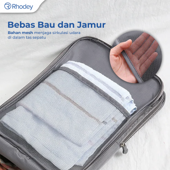 | Bebas Bau dan Jamur Tak ada bau tak sedap atau jamur yang muncul pada alas kaki saat disimpan di dalam tas sepatu Rhodey. Bagian depannya terbuat dari bahan mesh untuk menjaga sirkulasi udara di dalamnya. |