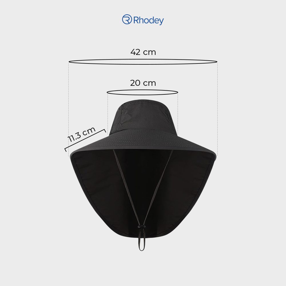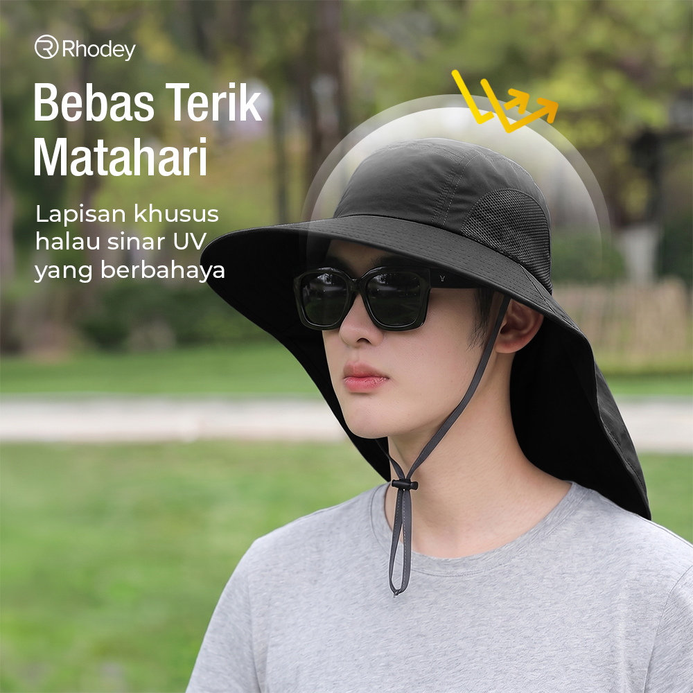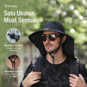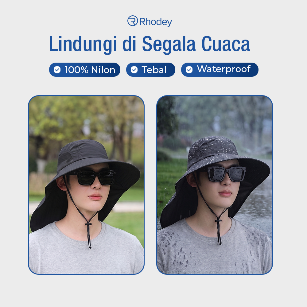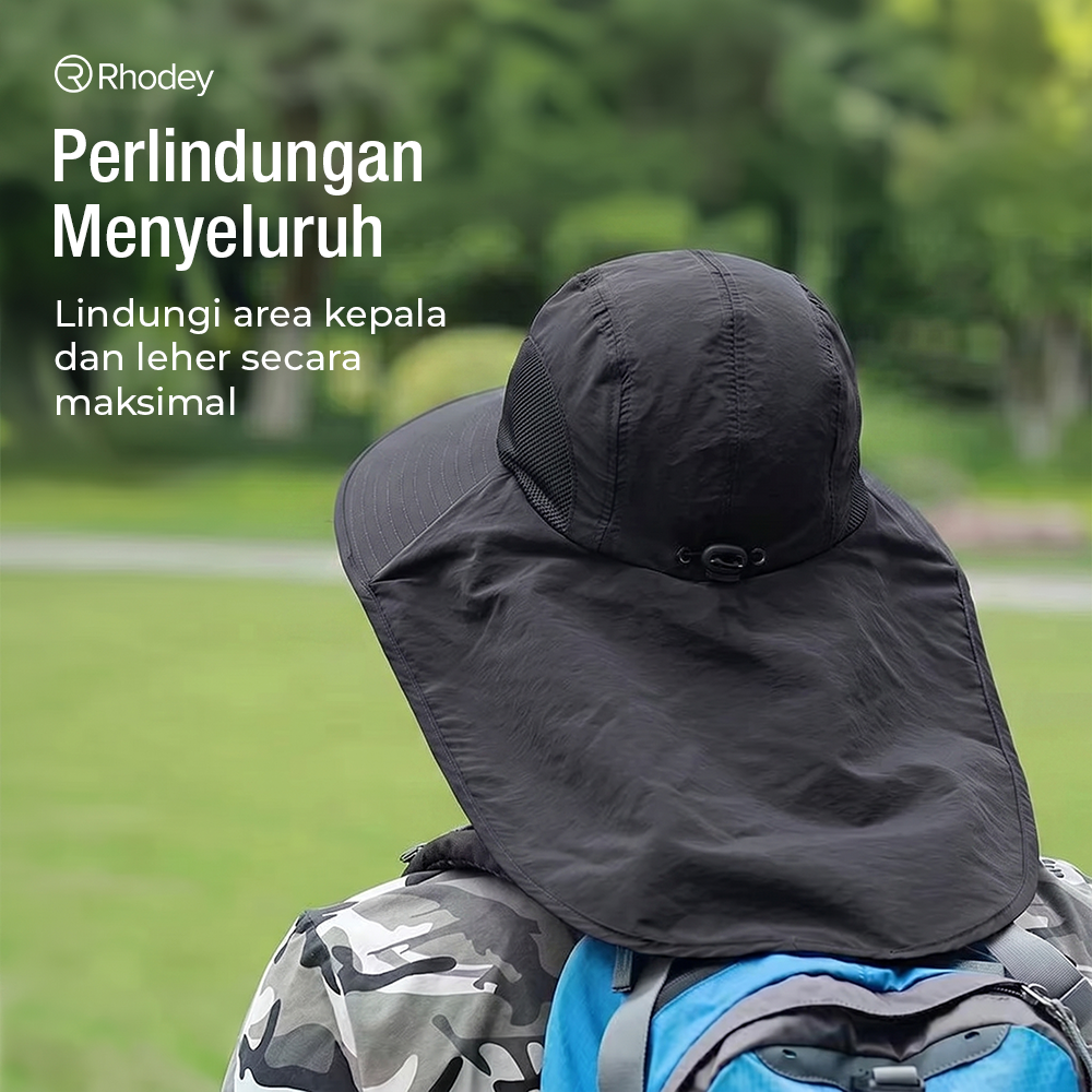 Topi outdoor Rhodey dengan desain lebar, bahan nilon waterproof, dan ventilasi mesh. Lindungi kepala dan leher dari panas, tetap sejuk dan nyaman saat memancing, hiking, atau beraktivitas di luar.