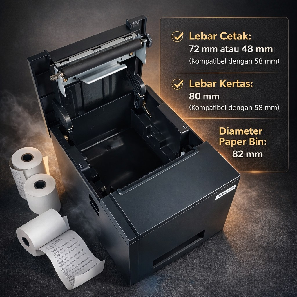 | Kompatibel Banyak Ukuran Kertas Mendukung kertas thermal 80 mm sebagai ukuran utama dan kompatibel dengan 58 mm. Area cetak maksimal mencapai 72 mm sehingga cocok untuk label resi marketplace dan struk kasir. Fleksibilitas ini memudahkan Anda memakai ukuran roll yang umum dijual di pasaran. Praktis dan hemat biaya operasional. |
