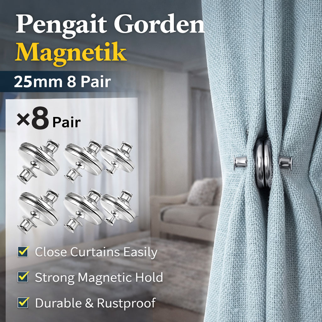 Dilengkapi magnet berkekuatan tinggi yang menjepit gorden dengan erat tanpa mudah lepas. Pengait ini mudah digunakan, cukup tempelkan kedua sisi magnet untuk menjepit gorden dengan rapi. Desain ini praktis tanpa perlu tali tambahan dan tidak merusak kain gorden, cocok untuk berbagai jenis gorden tipis maupun tebal.