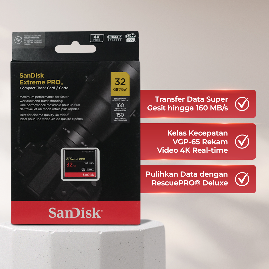 Kartu memori SanDisk Extreme PRO Flash Card menawarkan performa terbaik untuk penuhi tuntutan fotografi profesional. Simpan dan jaga kualitas file dengan resolusi tinggi kini lebih gesit berkat kecepatan transfer hingga 150 MB/s. Kelas kecepatan VPG-65 dapat digunakan untuk merekam video resolusi 4K real time. Kompatibel dengan berbagai kamrea DSLR dan camcorder.