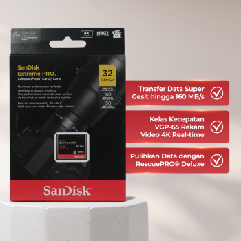| Kapasitas Pas untuk Sehari-hari Dibuat untuk Anda yang bekerja dengan banyak file penting, flashdisk ini dengan kapasitas 32 GB. Gunakan SanDisk Extreme PRO untuk menyimpan dan mentransfer data penting sehari-hari. |