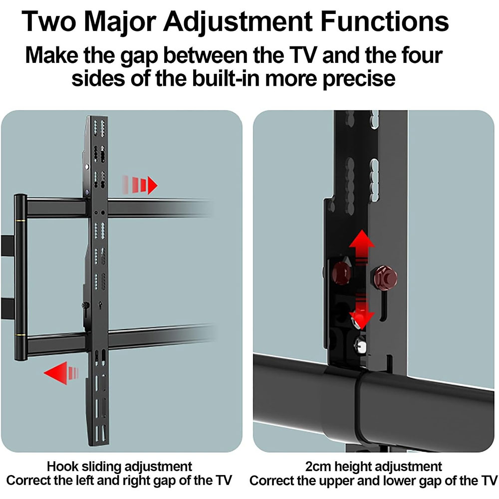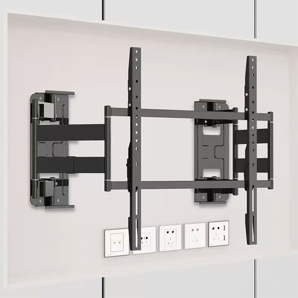 | Desain Telescopic Bracket dilengkapi sistem rel teleskopik yang memungkinkan penyesuaian posisi TV secara horizontal. Fitur ini memudahkan proses centering agar TV tepat berada di tengah dinding. Sangat membantu jika titik baut dinding tidak simetris atau ingin fleksibilitas penempatan. Desain ini juga memudahkan akses kabel di belakang TV tanpa harus membongkar seluruh bracket. |