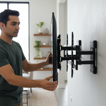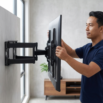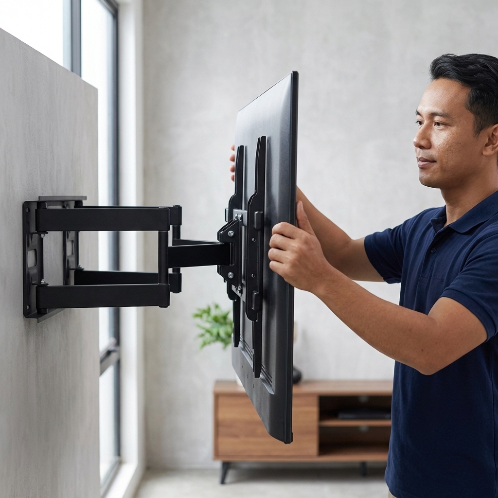 | Pemasangan TV di Dinding (Wall Mount) Bracket ini memungkinkan TV dipasang langsung ke dinding tanpa menggunakan meja atau rak tambahan. Dengan metode pemasangan ini, ruangan menjadi lebih luas, bersih, dan minim kabel berantakan. Solusi ideal untuk hunian modern maupun ruang profesional yang mengutamakan kerapian. |