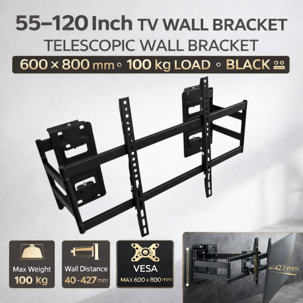 Bracket TV ini dirancang untuk menopang TV ukuran sangat besar hingga 120 Inch dengan sistem lengan teleskopik yang fleksibel. Cocok untuk Smart TV, LED TV, LCD TV, OLED TV maupun TV komersial dengan pola VESA besar hingga 600 x 800 mm. Dengan kapasitas beban maksimal 100 kg, bracket ini ideal untuk home theater, ruang meeting, aula, hotel, restoran, hingga area komersial.
