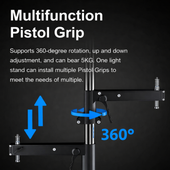 | Pistrol Grip Multifungsi Fitur pistol grip memungkinkan kepala grip berputar 360° sehingga posisi lampu, kamera atau aksesoris bisa diatur ke segala arah tanpa perlu bongkar pasang. Grip ini juga mendukung pengaturan naik-turun di sepanjang tiang, dengan daya tahan beban hingga 5 kg, grip ini tetap stabil meski digunakan untuk perangkat profesional. |