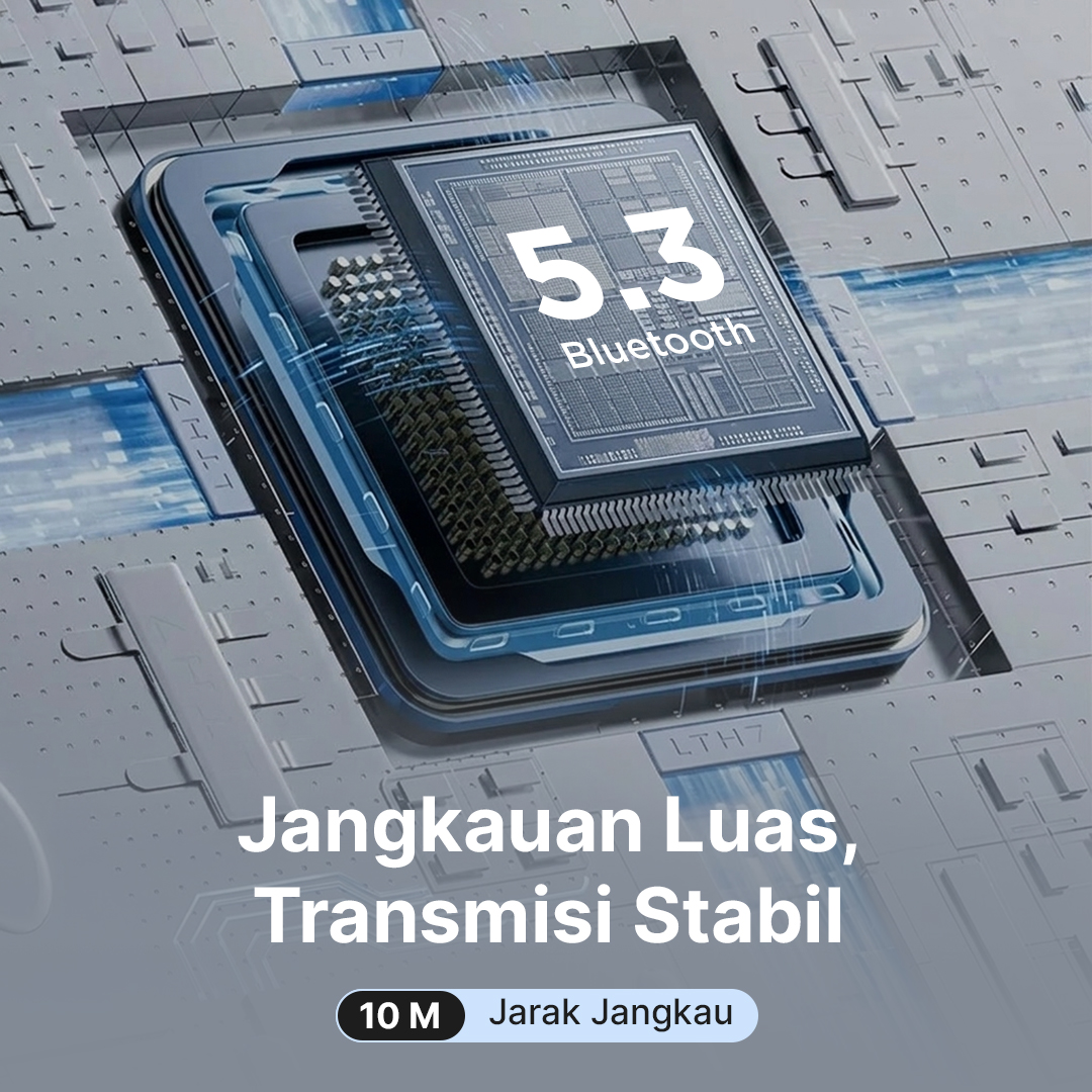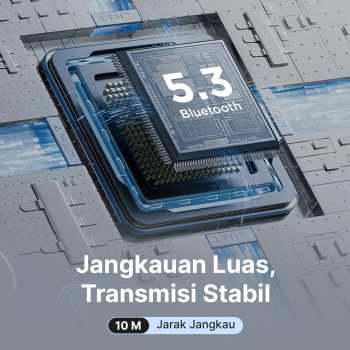 | Jangkauan Luas, Transmisi Stabil Menggunakan koneksi bluetooth 5.3, headphone ini dapat dihubungkan ke berbagai jenis smartphone. Teknologi generasi terbaru ini lebih stabil dan bebas lag dengan jarak transmisi hingga 10 M yang sesuai untuk perjalanan jauh. |