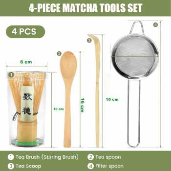 | Takaran Presisi di Tiap Sajian Dilengkapi chashaku (spatula bambu) dan sendok aduk, set ini memudahkan Anda mengambil takaran matcha yang konsisten untuk setiap seduhan. Pengukuran yang presisi membantu menciptakan rasa yang stabil, tidak terlalu pahit atau terlalu encer. |