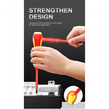 | Pegangan Ergonomis Handle obeng dirancang secara ergonomis untuk kenyamanan maksimal saat digunakan. Desain gelombang pada handle memastikan genggaman yang lebih baik dan mengurangi risiko slip saat bekerja. Material PP dan TPR pada handle memberikan cengkeraman yang kuat dan nyaman. |