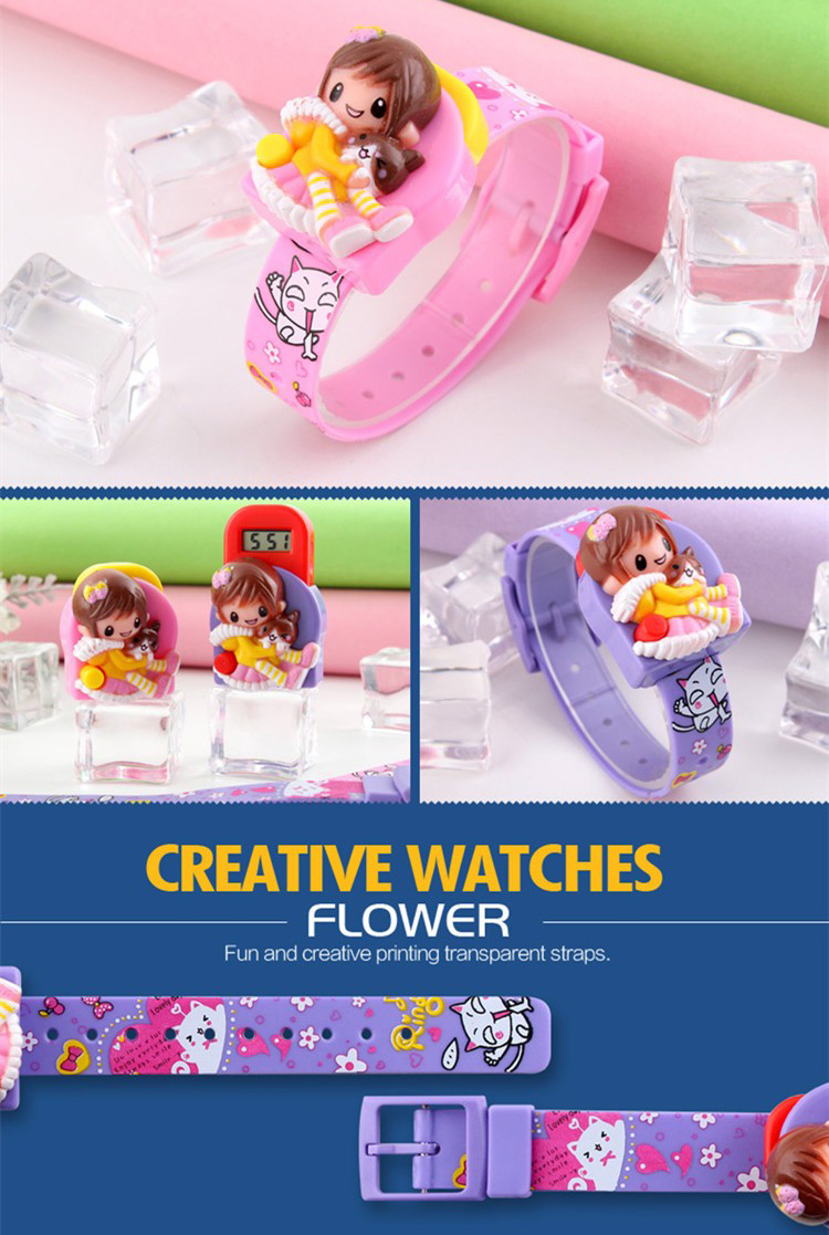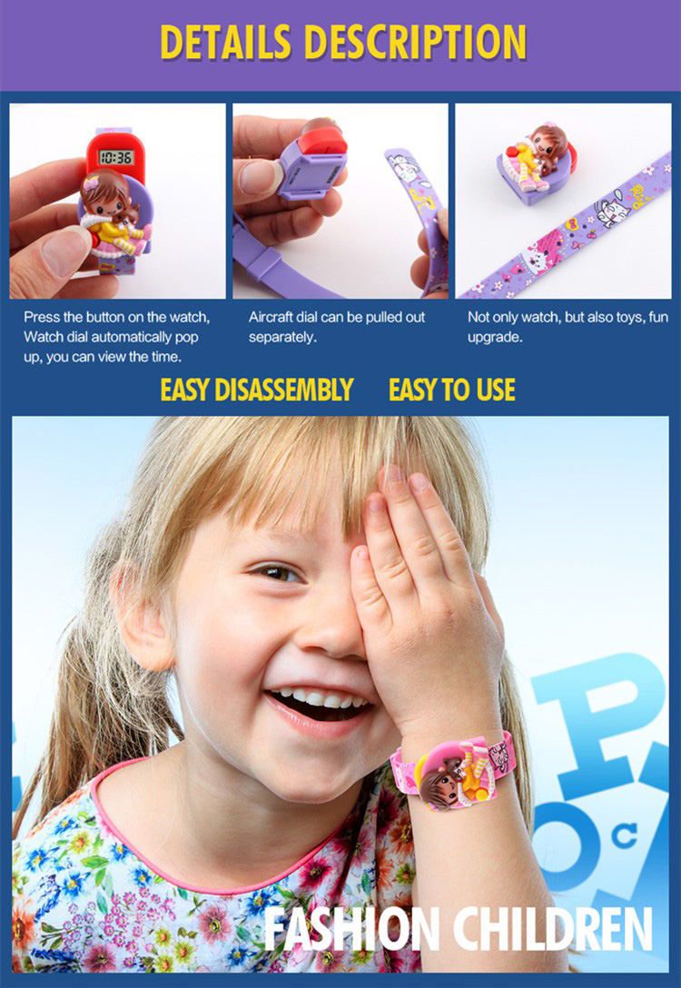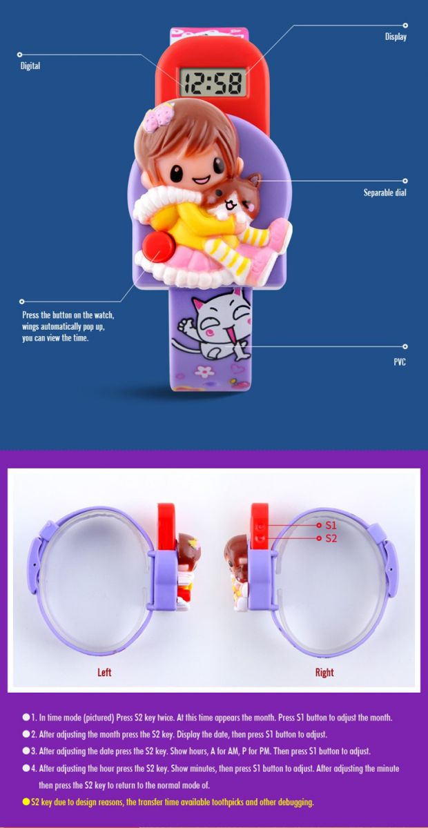 | Tombol Unik Tekan tombol yang terdapat di bagian samping kiri kartun perempuan, dan layar LCD akan muncul keluar untuk menunjukkan jam, ketika sedang tidak dilihat, LCD dapat dimasukkan kembali ke balik case jam, fitur yang membuat anak merasa senang menggunakan jam tangan lucu ini.