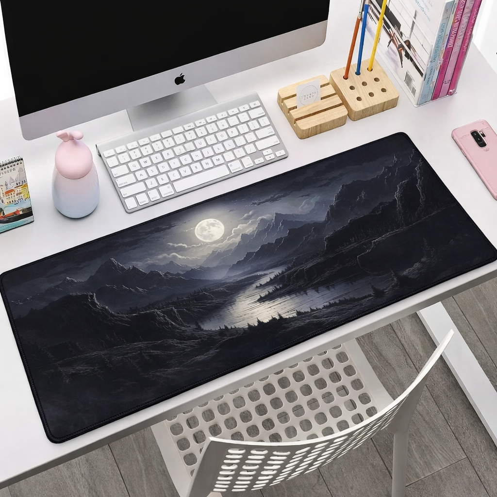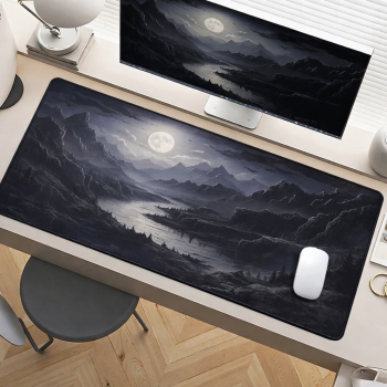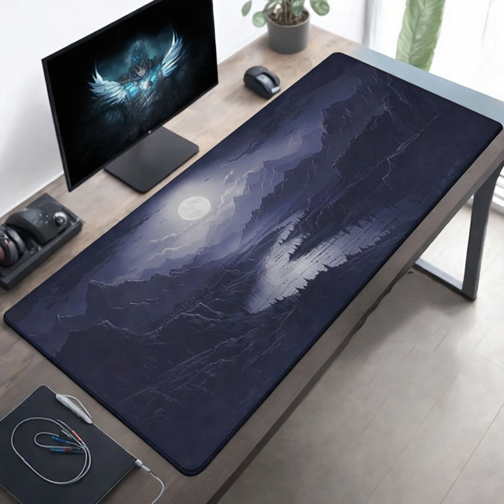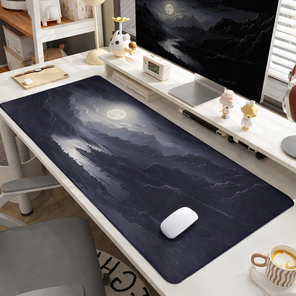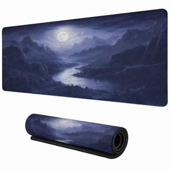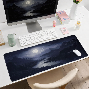 Mouse pad ini hadir dengan motif pemandangan malam dengan sungai dan bulan yang memberikan tampilan unik pada meja komputer Anda. Desain ini membuat setup gaming atau workstation terlihat lebih menarik dan berkarakter. Selain berfungsi sebagai alas mouse, desk mat ini juga mempercantik dekorasi meja kerja.
