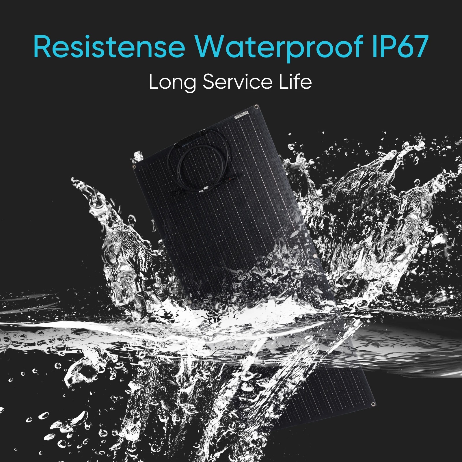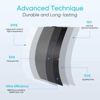 | Anti Gores & Transparansi Tinggi Permukaan panel menggunakan ETFE film dan material inti menggunakan monocrystalline berkualitas tinggi yang memiliki transparansi sangat baik untuk memaksimalkan penyerapan cahaya matahari. Material ETFE juga terkenal tahan gores, tahan cuaca ekstrem, dan lebih awet dibanding lapisan plastik biasa, menjadikannya cocok untuk penggunaan jangka panjang di luar ruangan. |